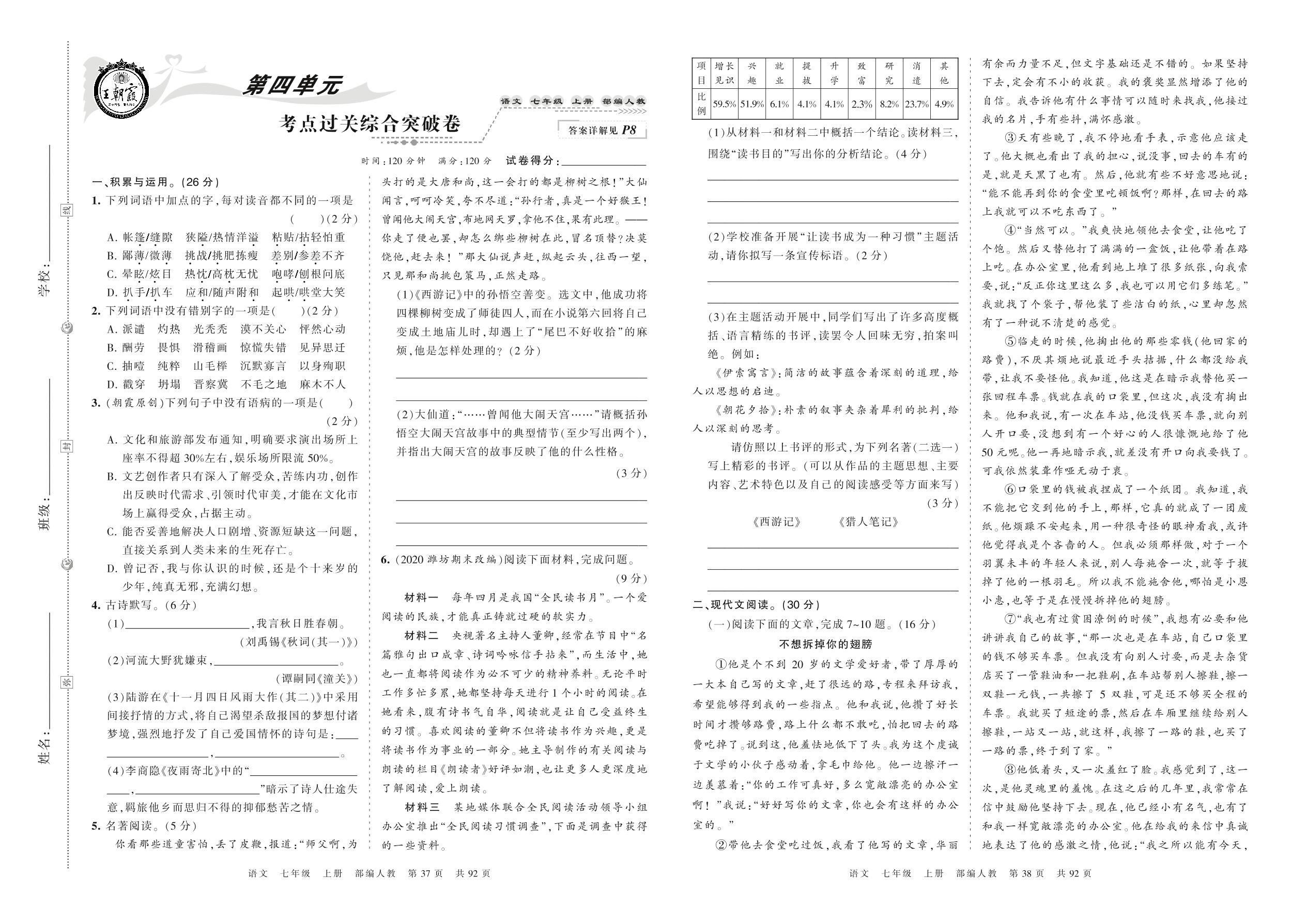 2020上册七年级语文人教版 第四单元 考点过关综合突破卷