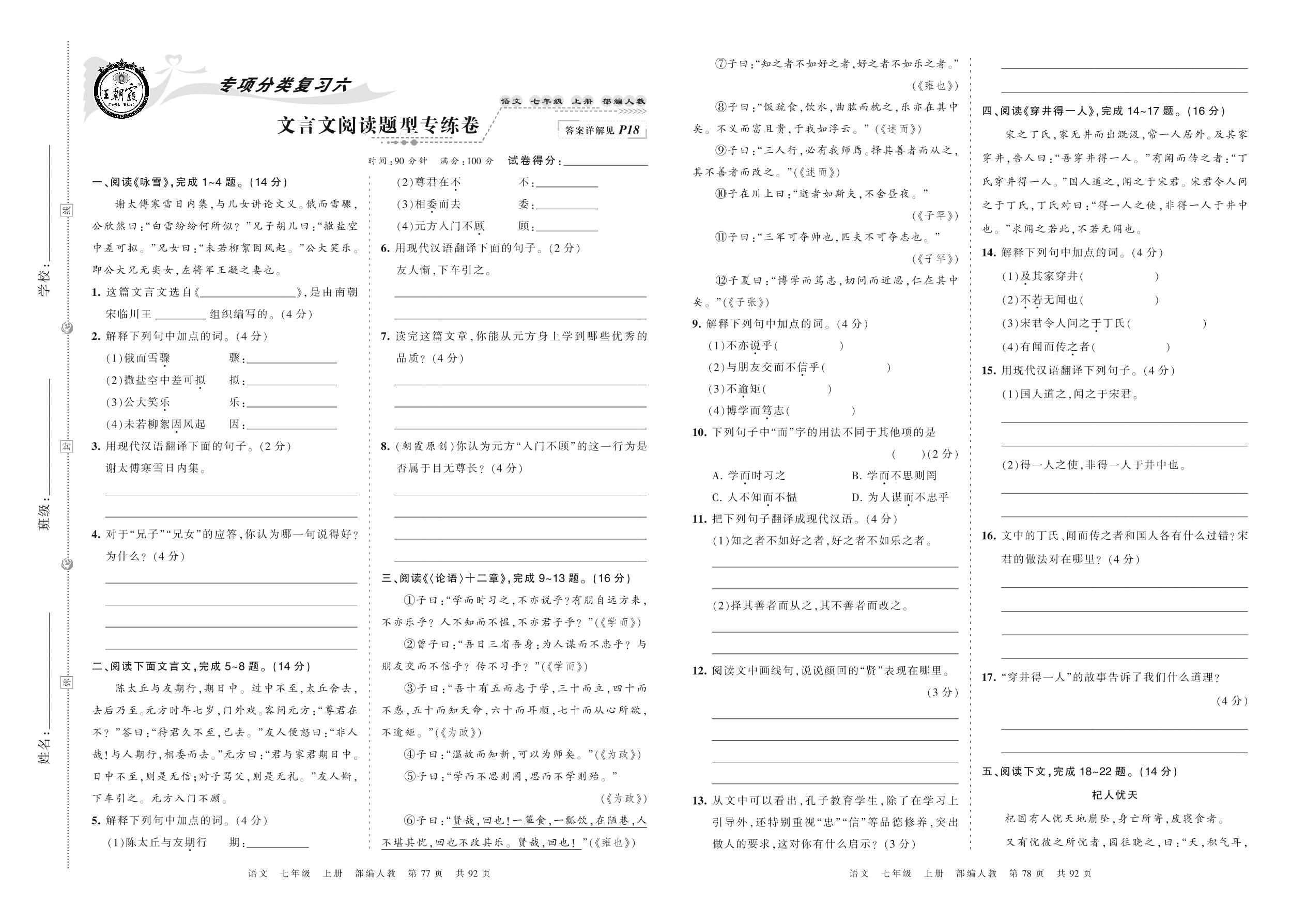 2020上册七年级语文人教版 文言文阅读题型专练卷