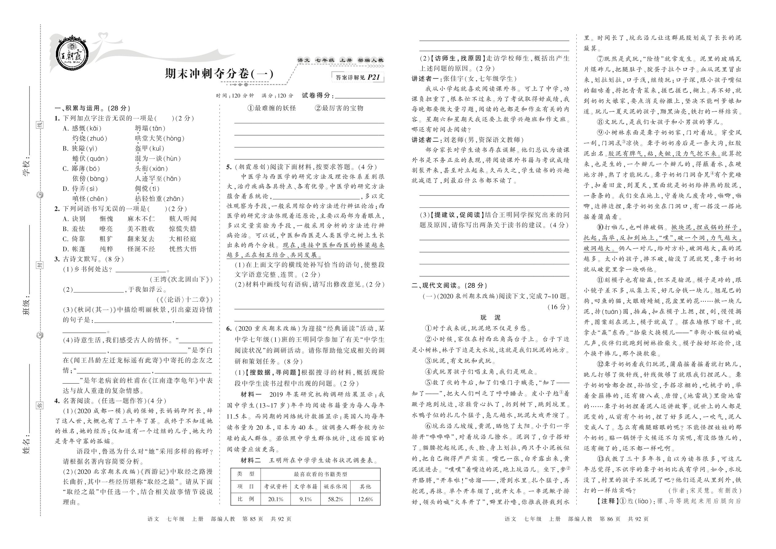 2020上册七年级语文人教版 期末冲刺夺分卷(一)