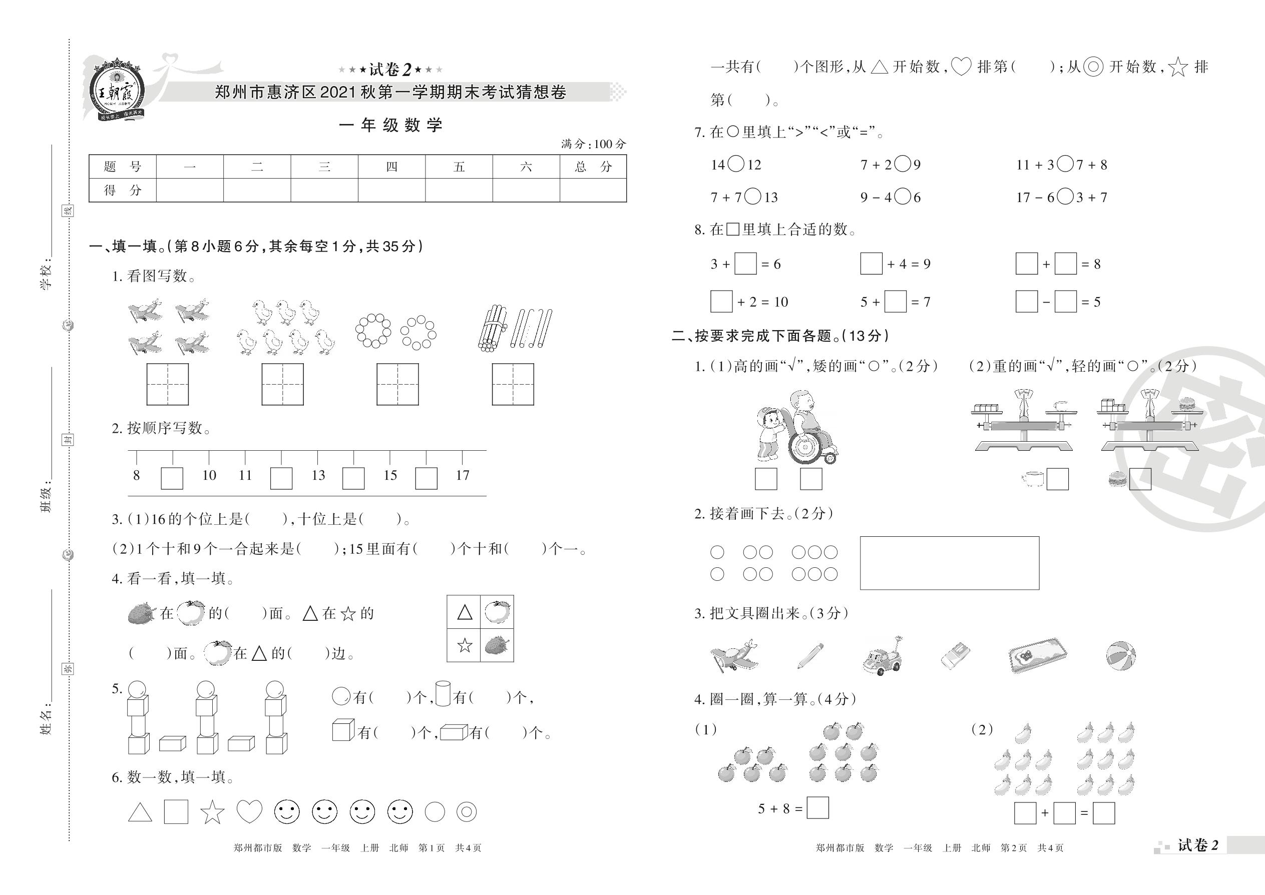 郑州市惠济区2021秋第一学期期末考试猜想卷一年级数学(北师版)【2】