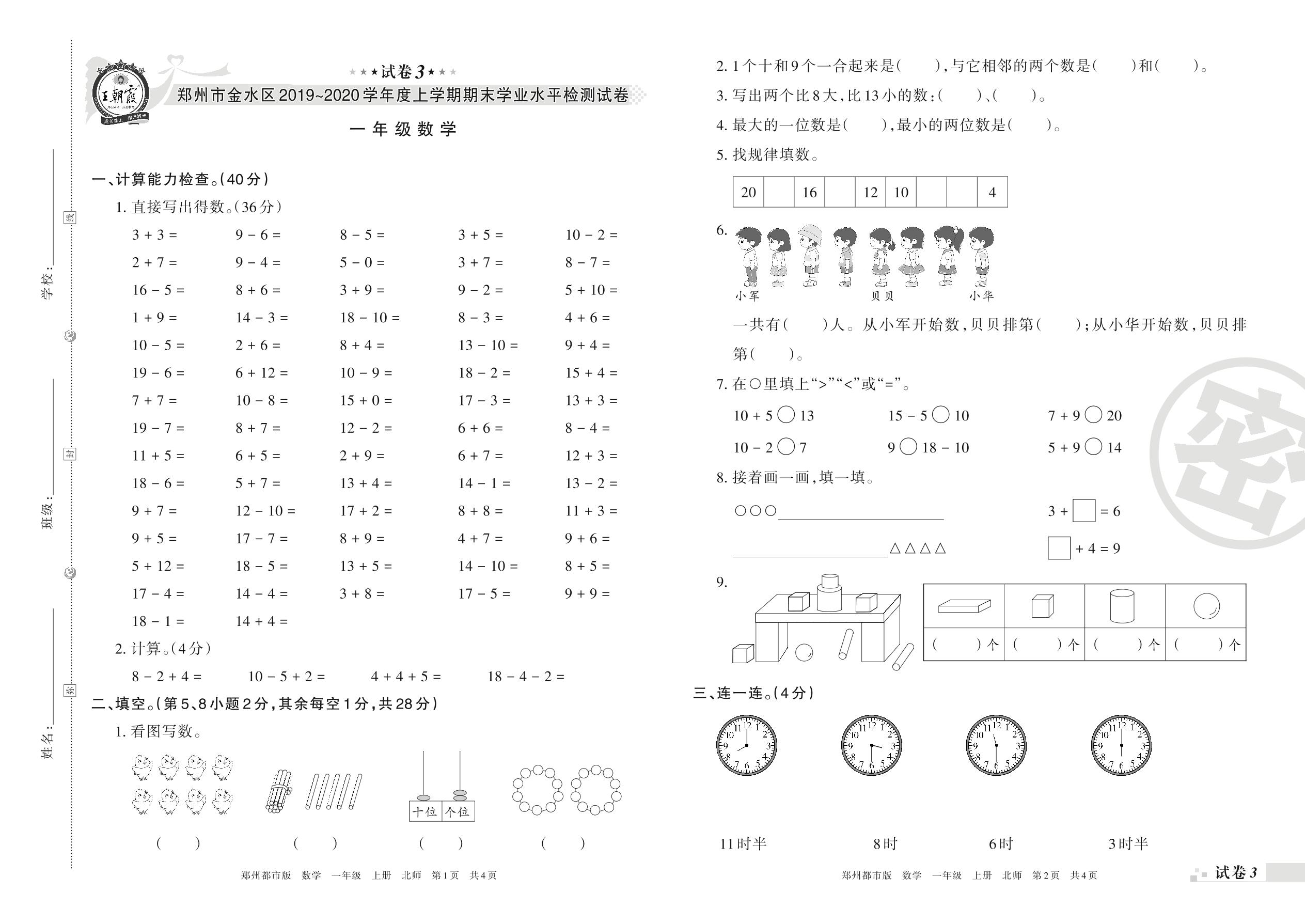 郑州市金水区2019~2020学年度上学期期末学业水平检测试卷一年级数学(北师版)【3】