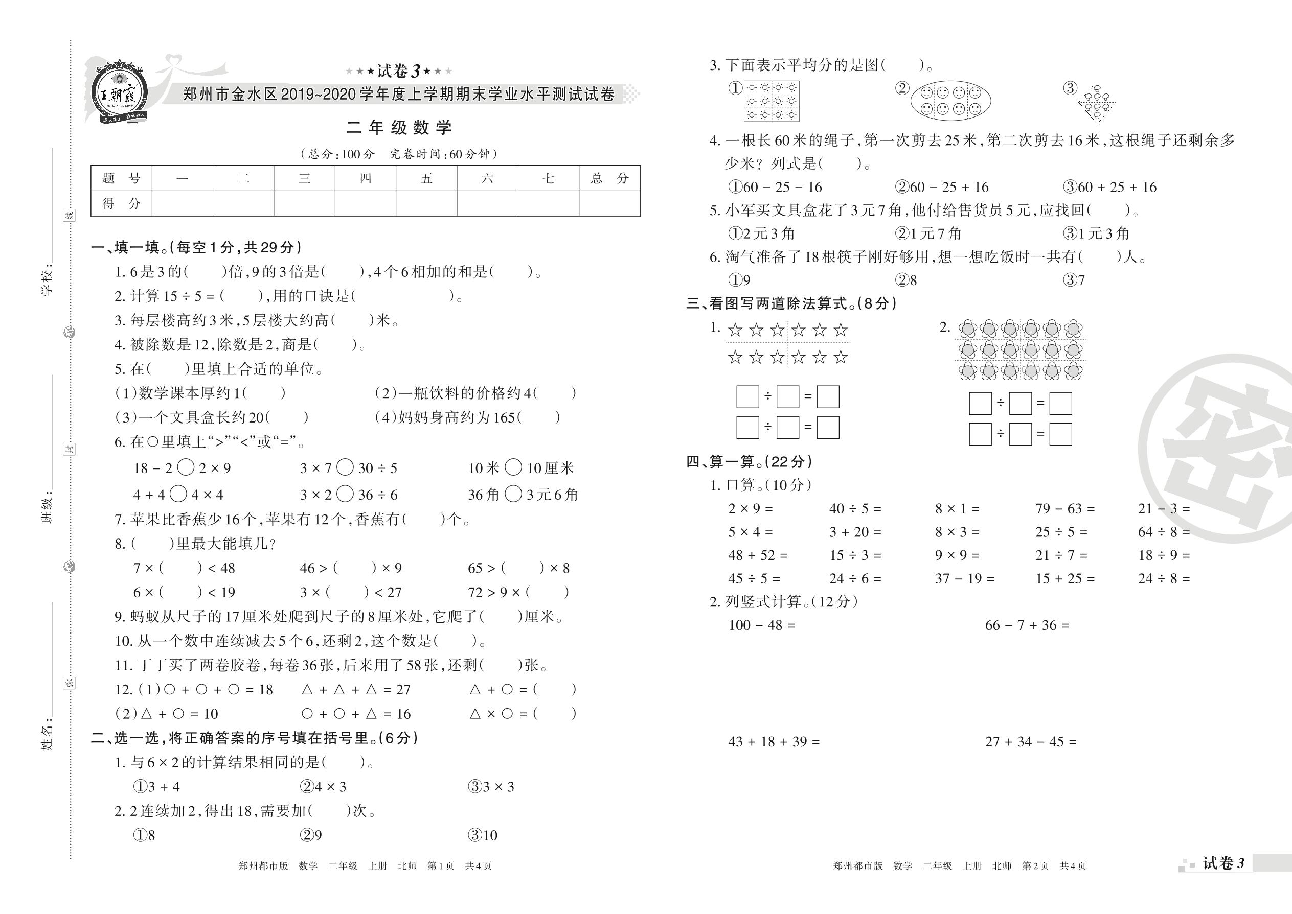 郑州市金水区2019~2020学年度上学期期末学业水平测试试卷二年级数学(北师版)【3】