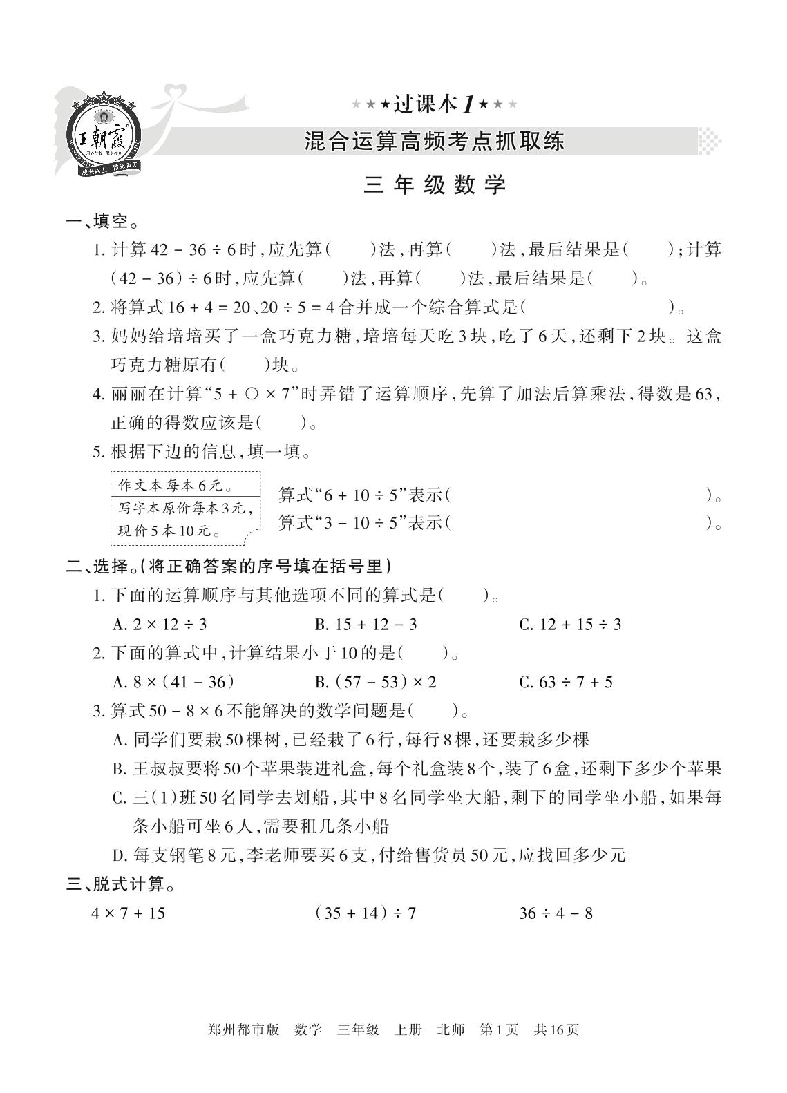 王朝霞期末过课本——混合运算高频考点抓取练三年级上册数学(北师版)_R211116170017526【1】