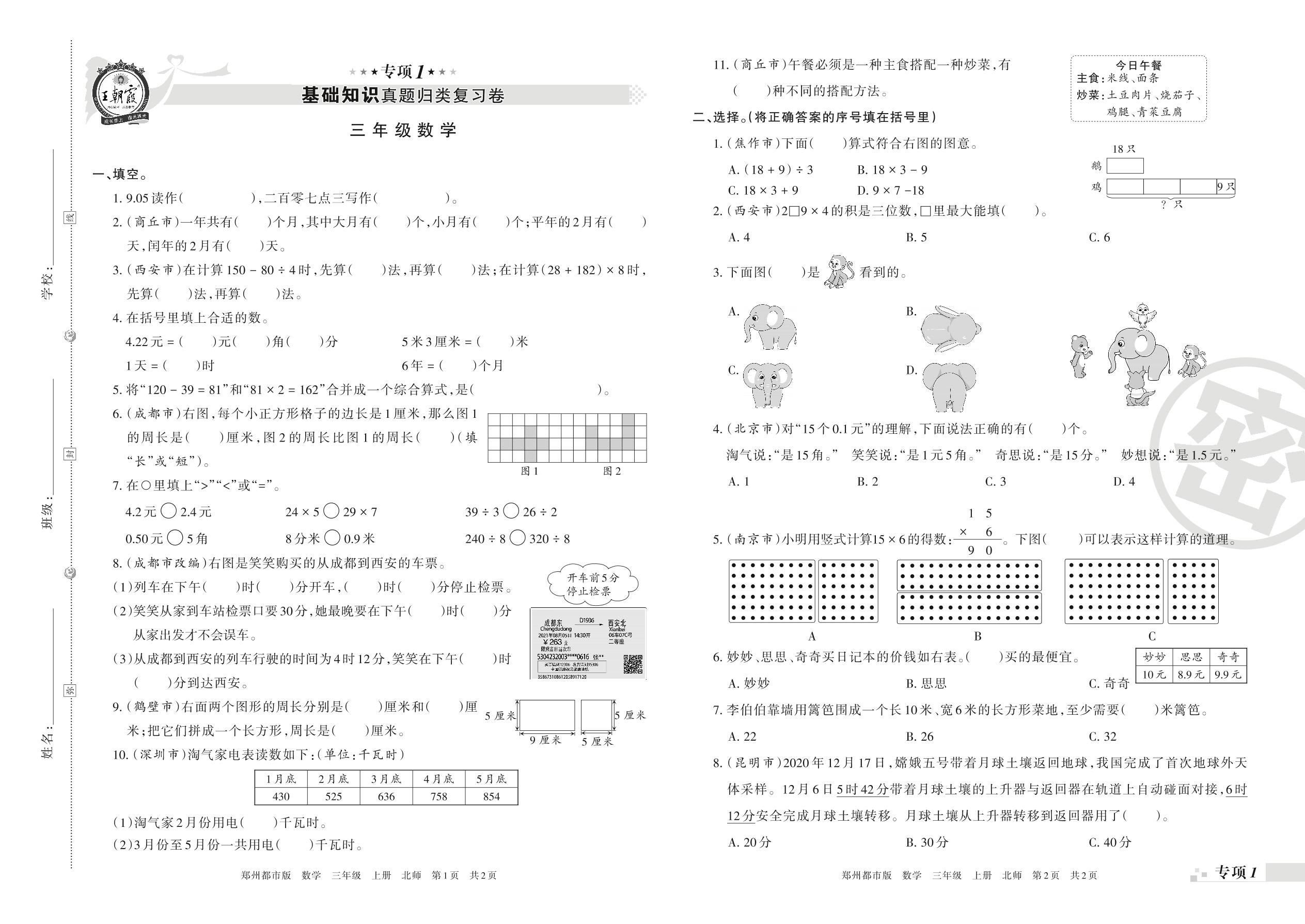 王朝霞期末专项卷——基础知识真题归类复习卷三年级上册数学(北师版)【1】