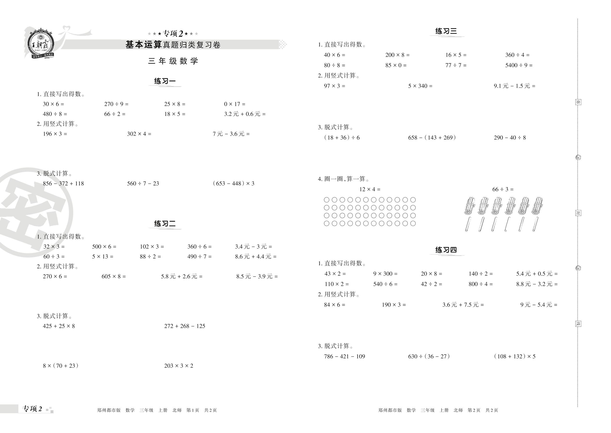 王朝霞期末专项卷——基本运算真题归类复习卷三年级上册数学(北师版)【2】