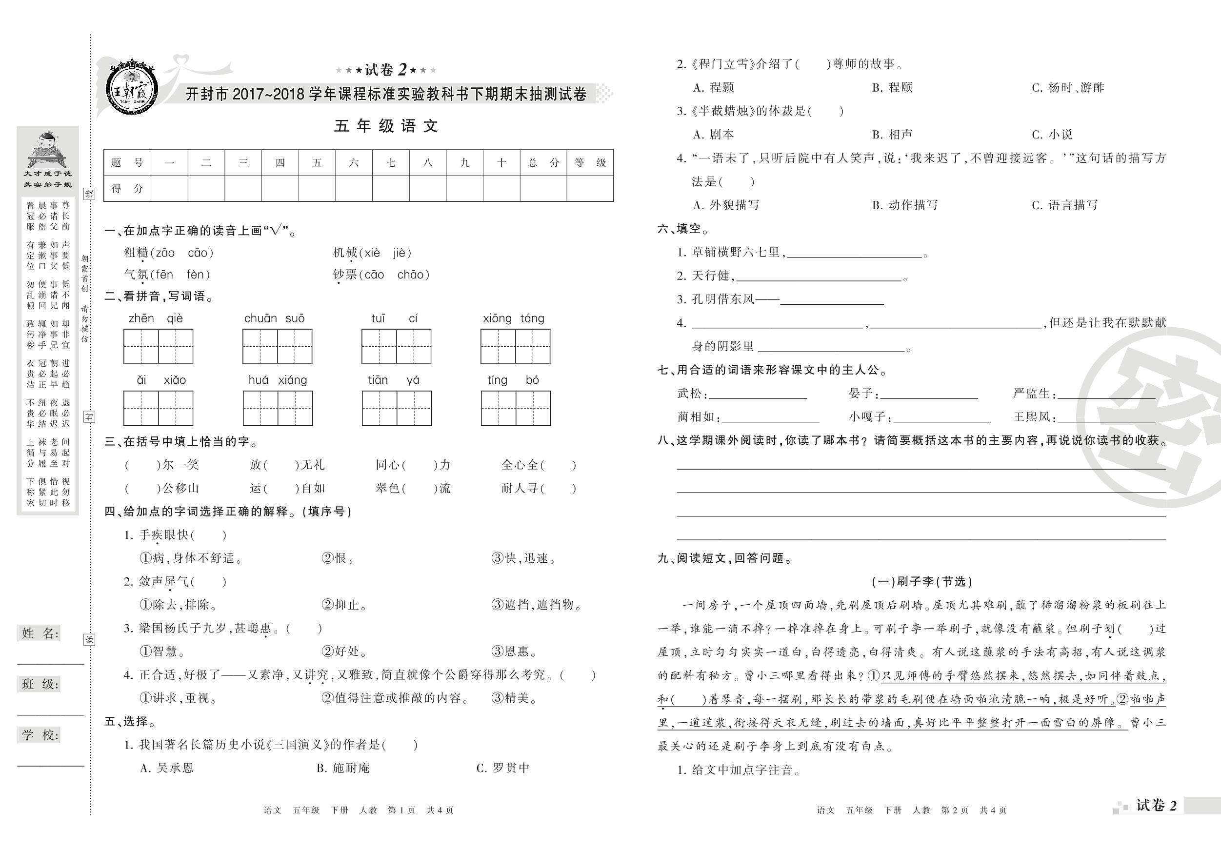 2017-2018学年第二学期开封市五年级语文试卷(人教版)_R210801202444【2】