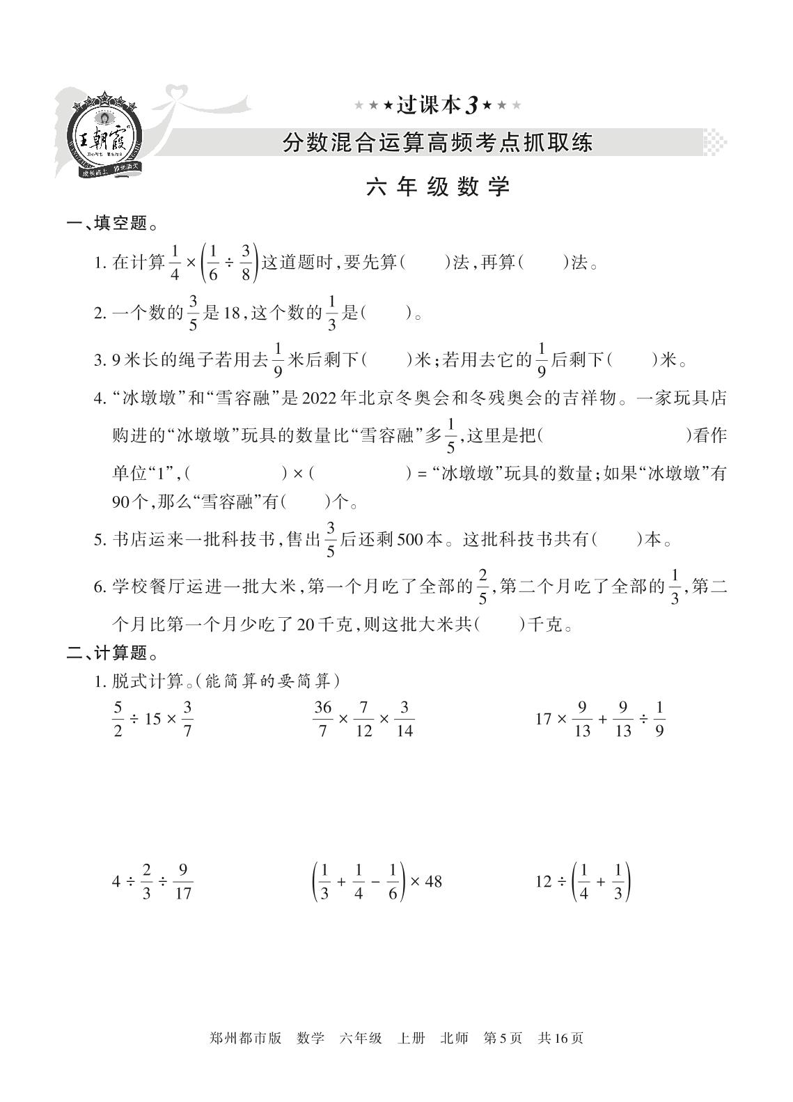 王朝霞期末过课本——分数混合运算高频考点抓取练六年级上册数学(北师版)_R211116171002088【3】
