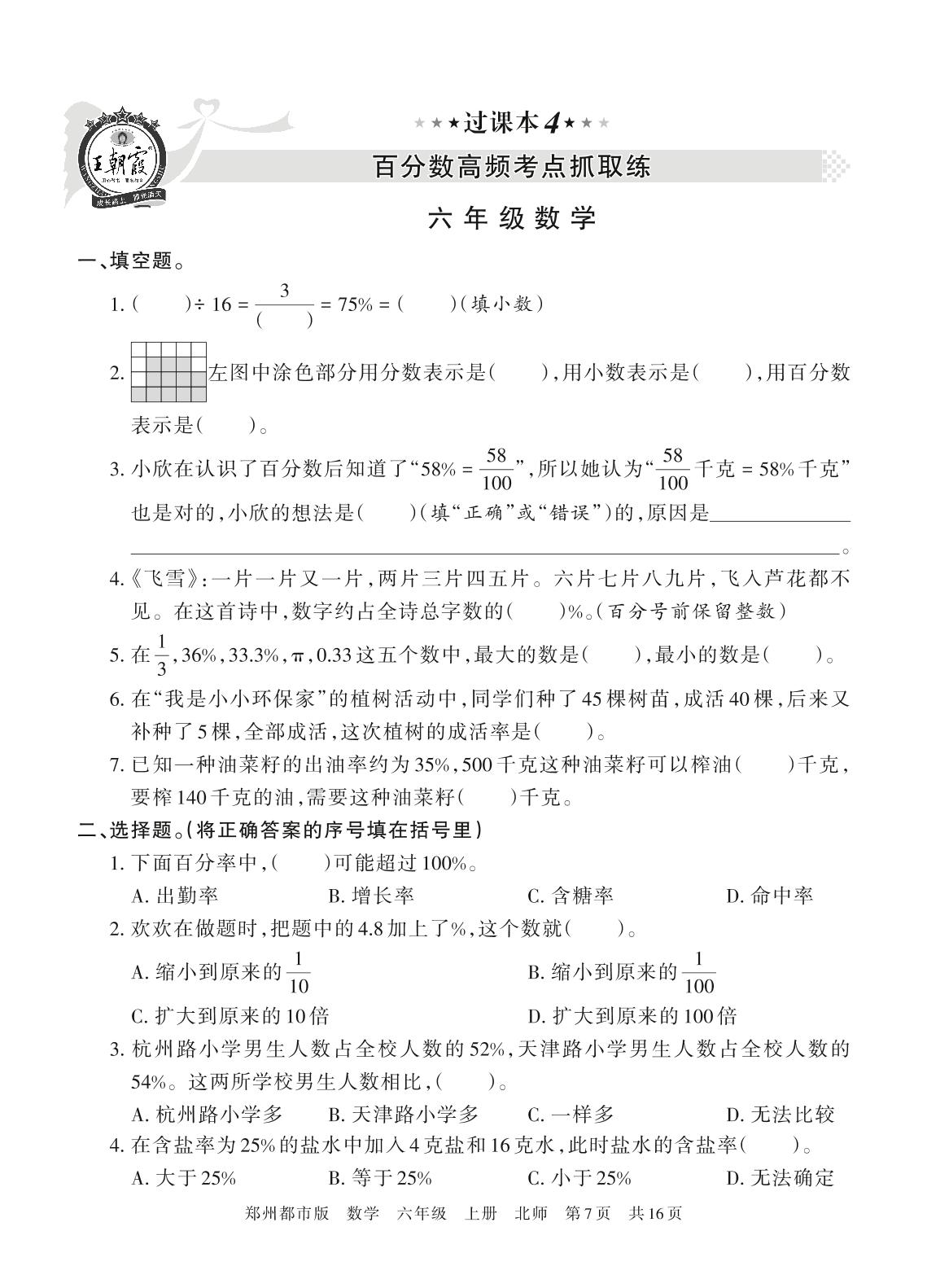 王朝霞期末过课本——百分数高频考点抓取练六年级上册数学(北师版)_R211116171002855【4】