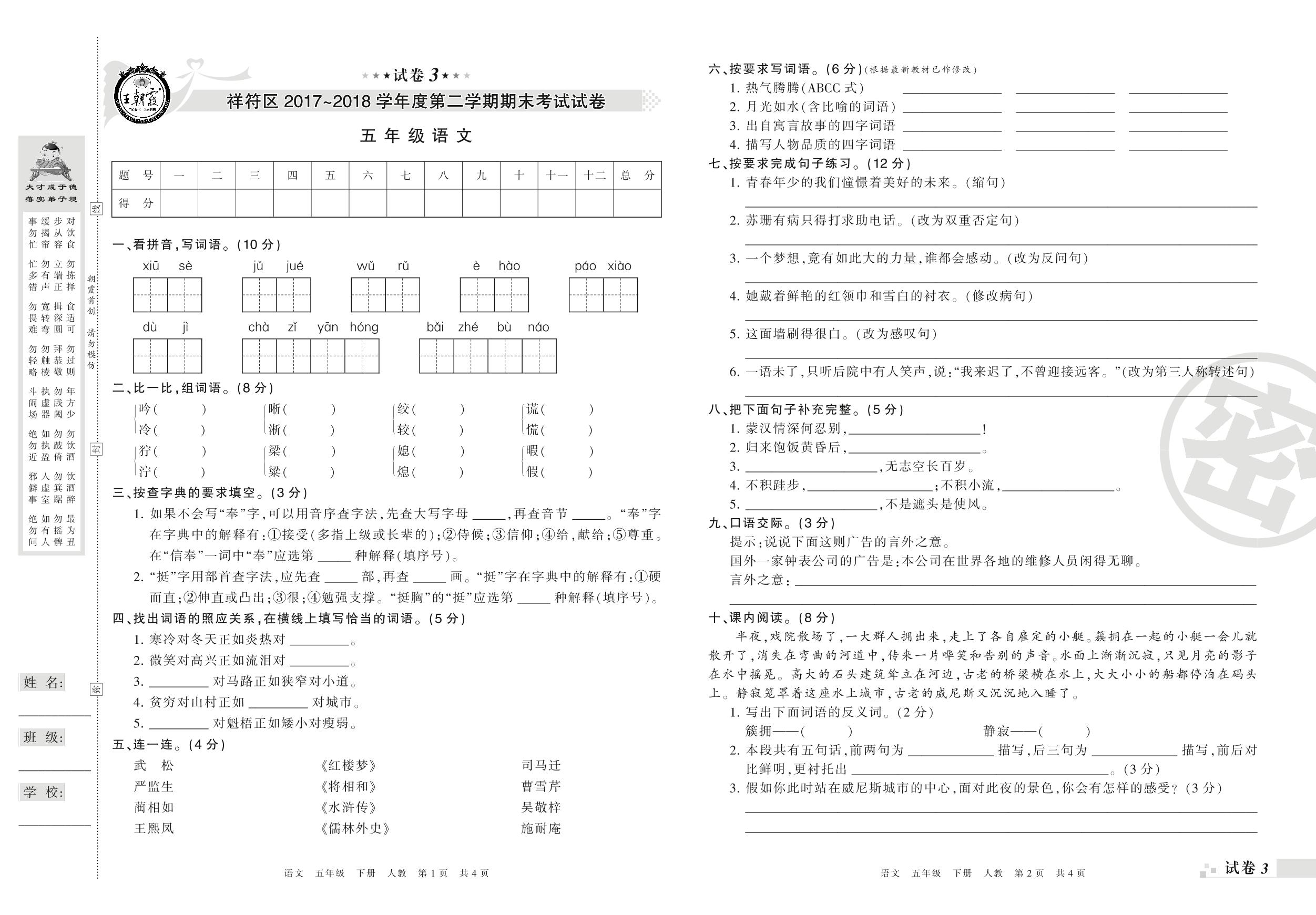 2017-2018学年第二学期开封市祥符区五年级语文试卷(人教版)【3】