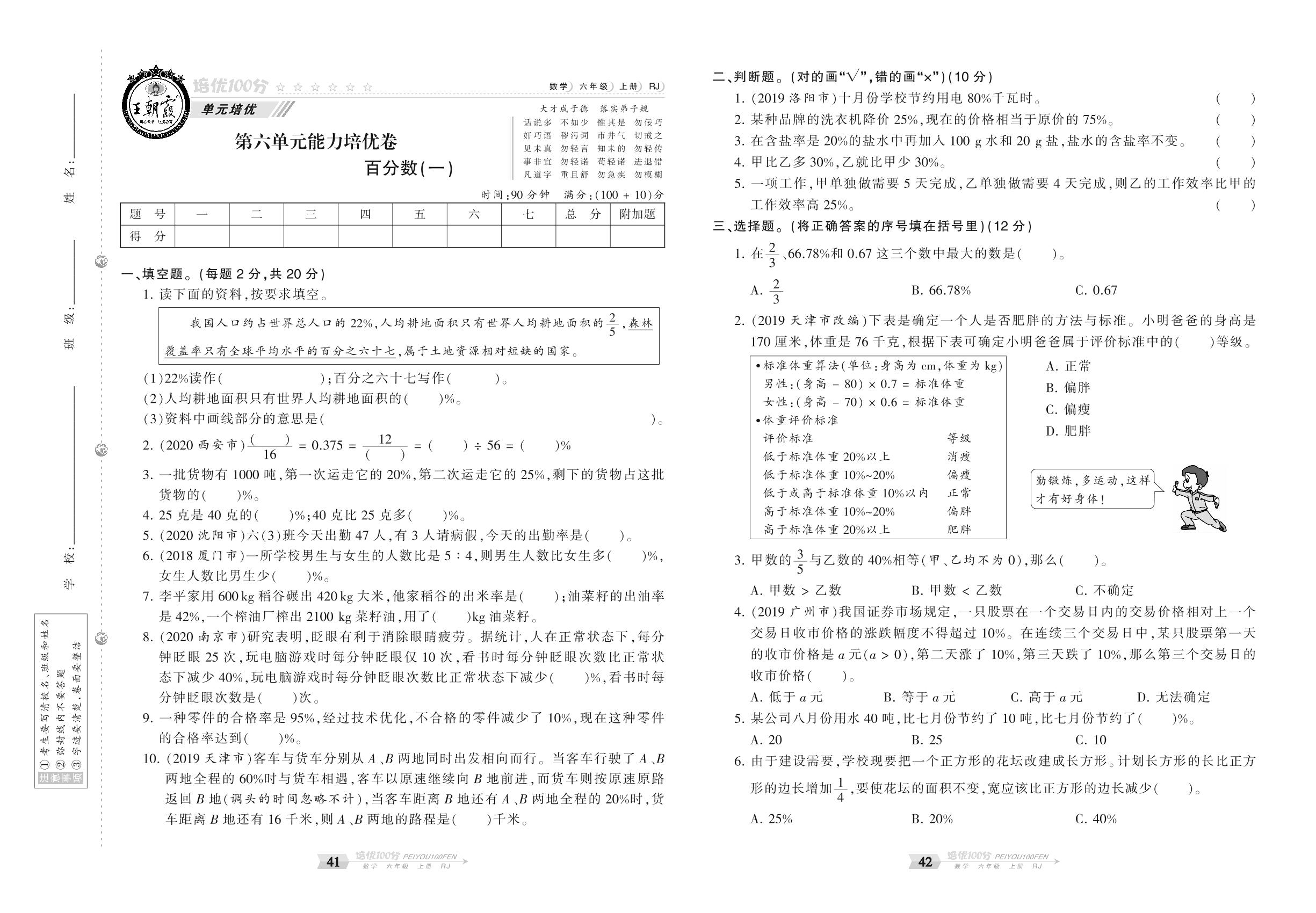 2020上册六年级数学人教版 第六单元 能力培优卷