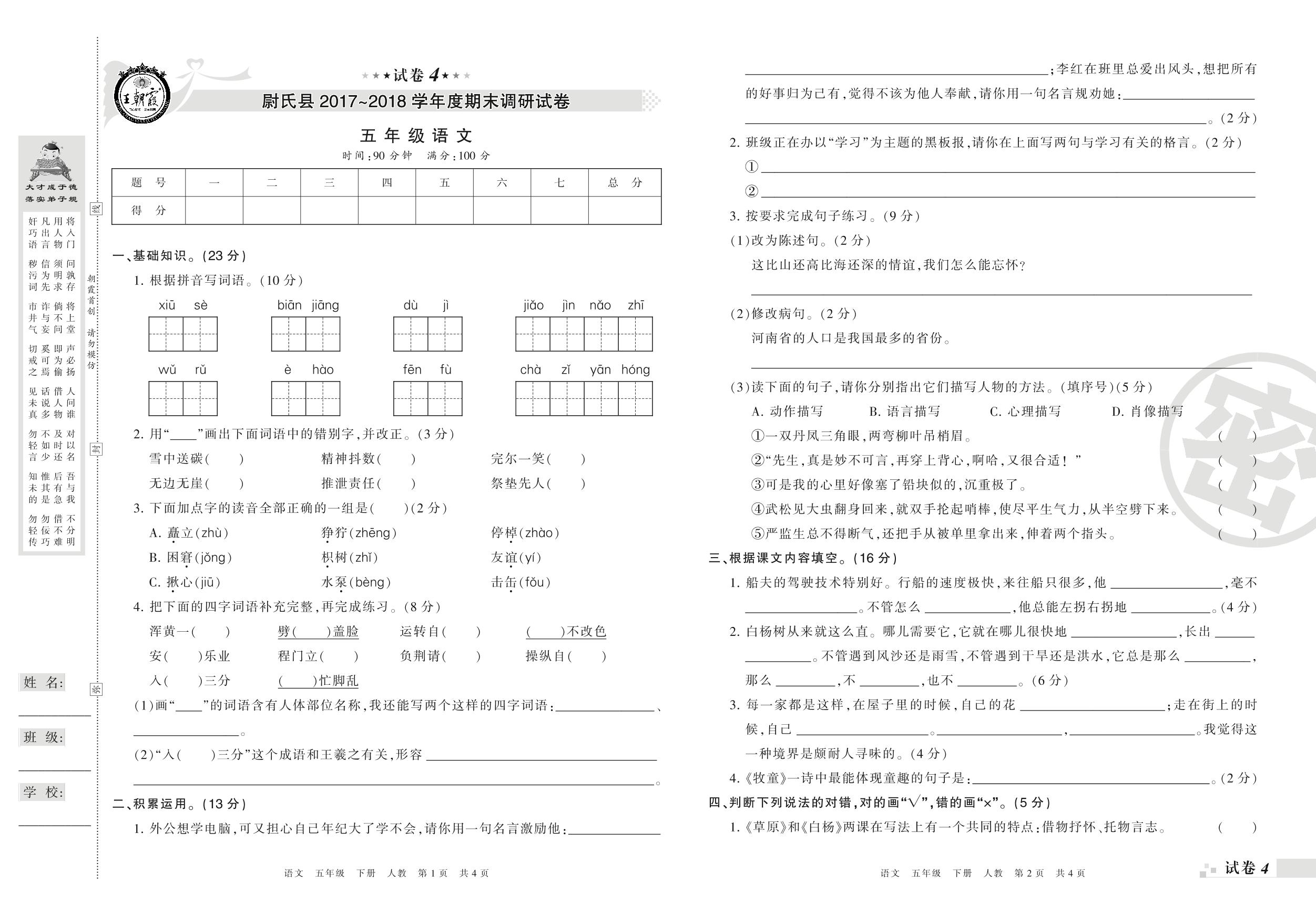 2017-2018学年第二学期开封市尉氏县五年级语文试卷(人教版)【4】