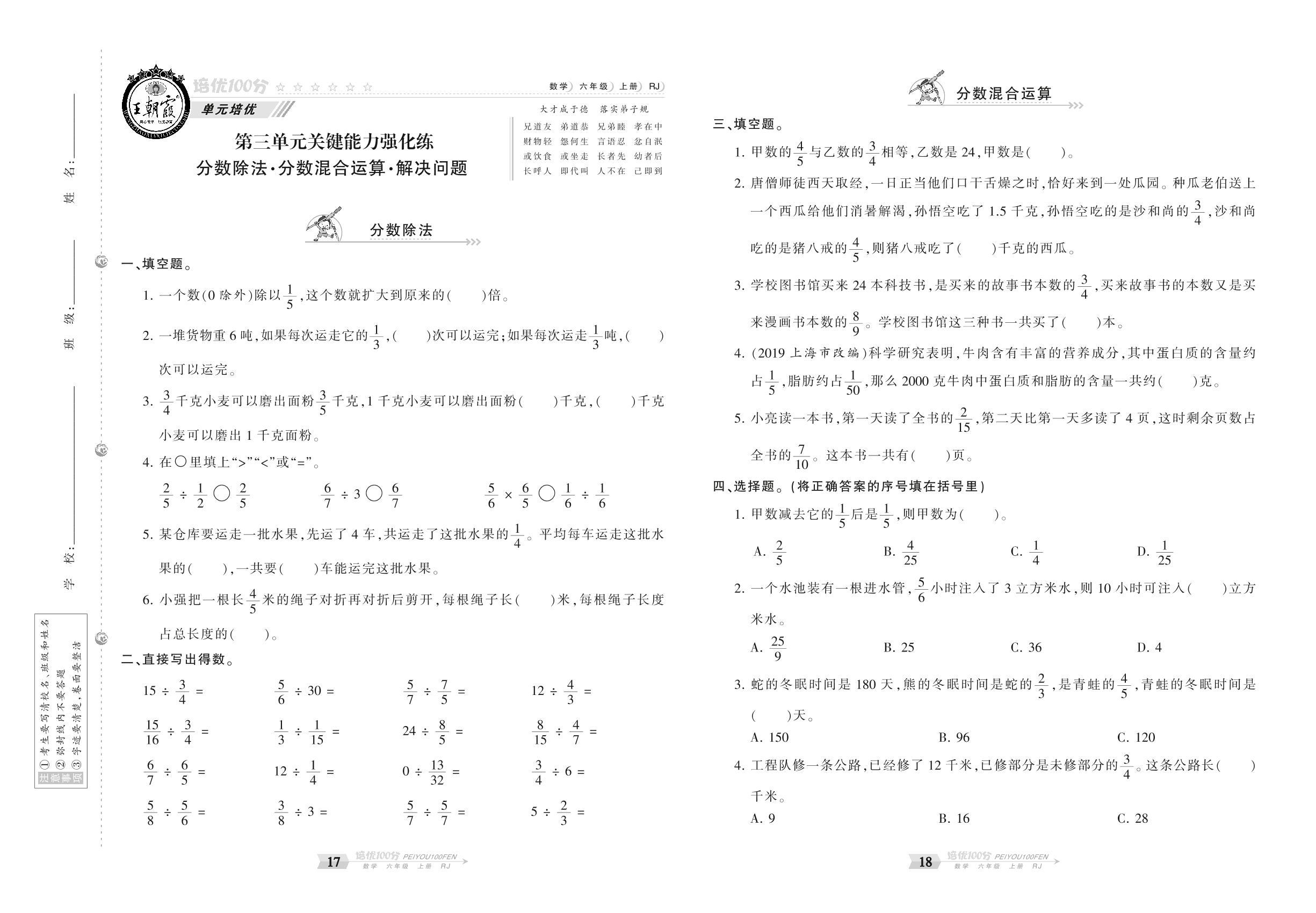 2020上册六年级数学人教版 第三单元 关键能力强化练