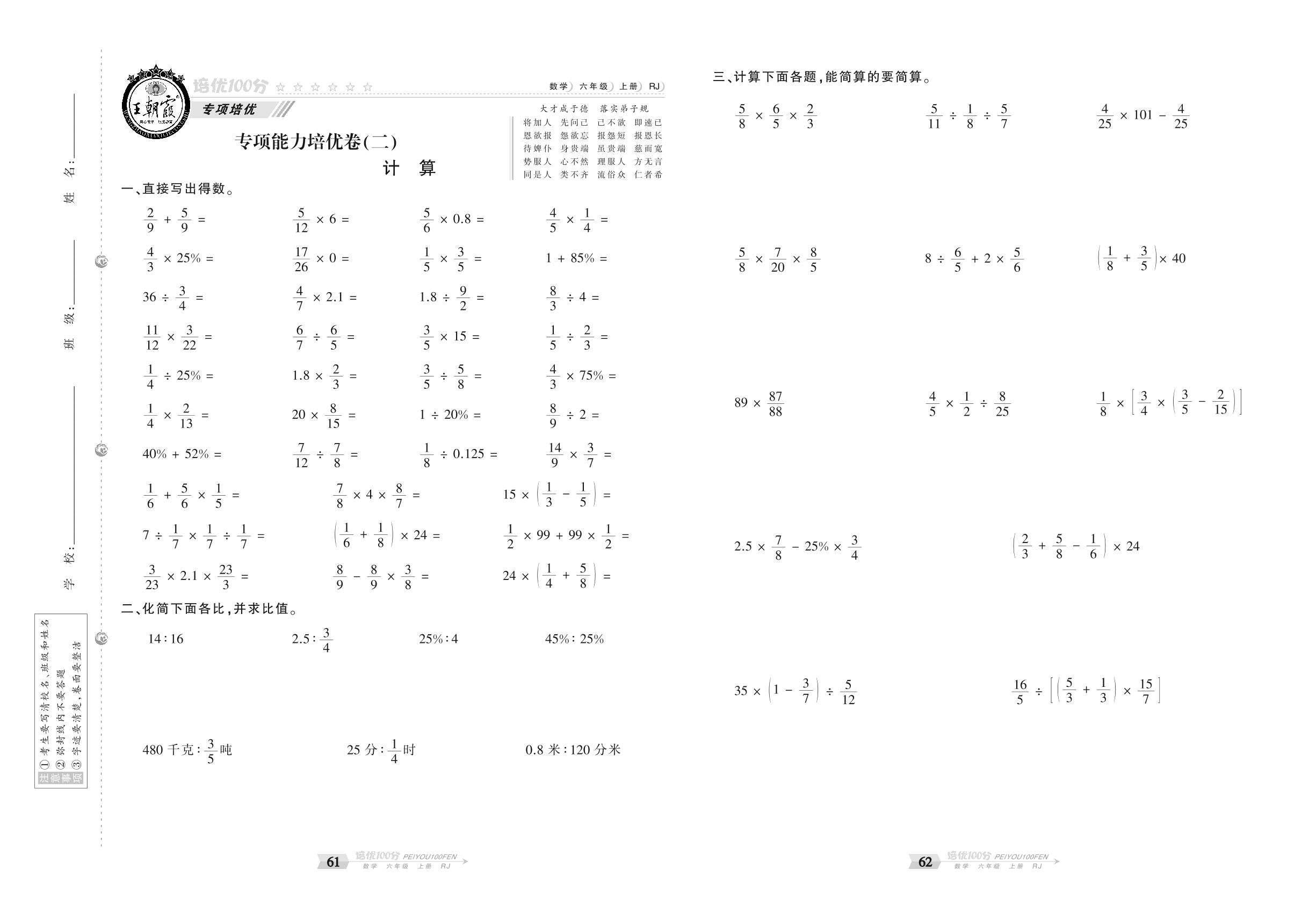 2020上册六年级数学人教版 专项能力培优卷(二) 计算