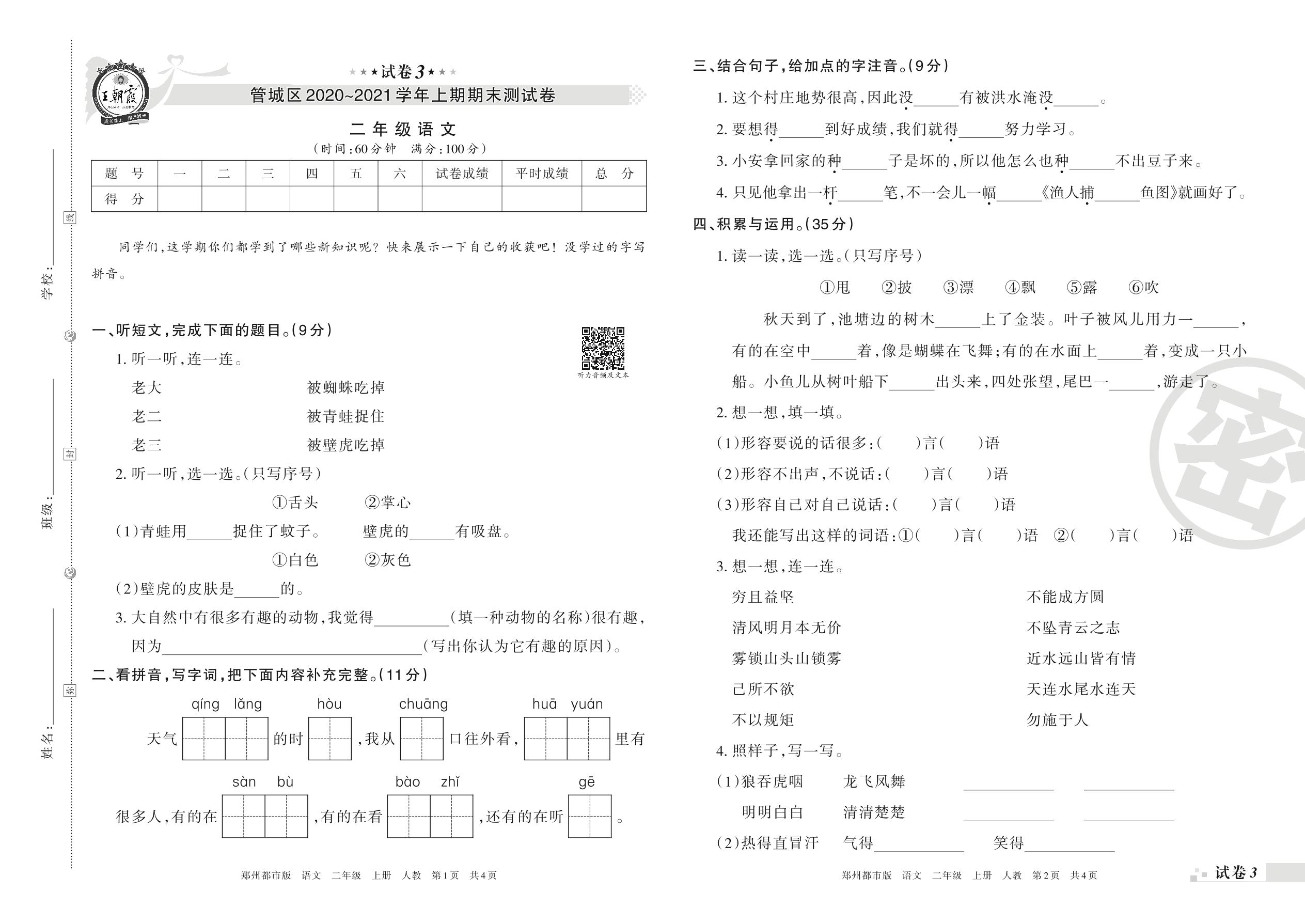 管城区2020~2021学年上期期末测试卷二年级语文(人教版)【3】