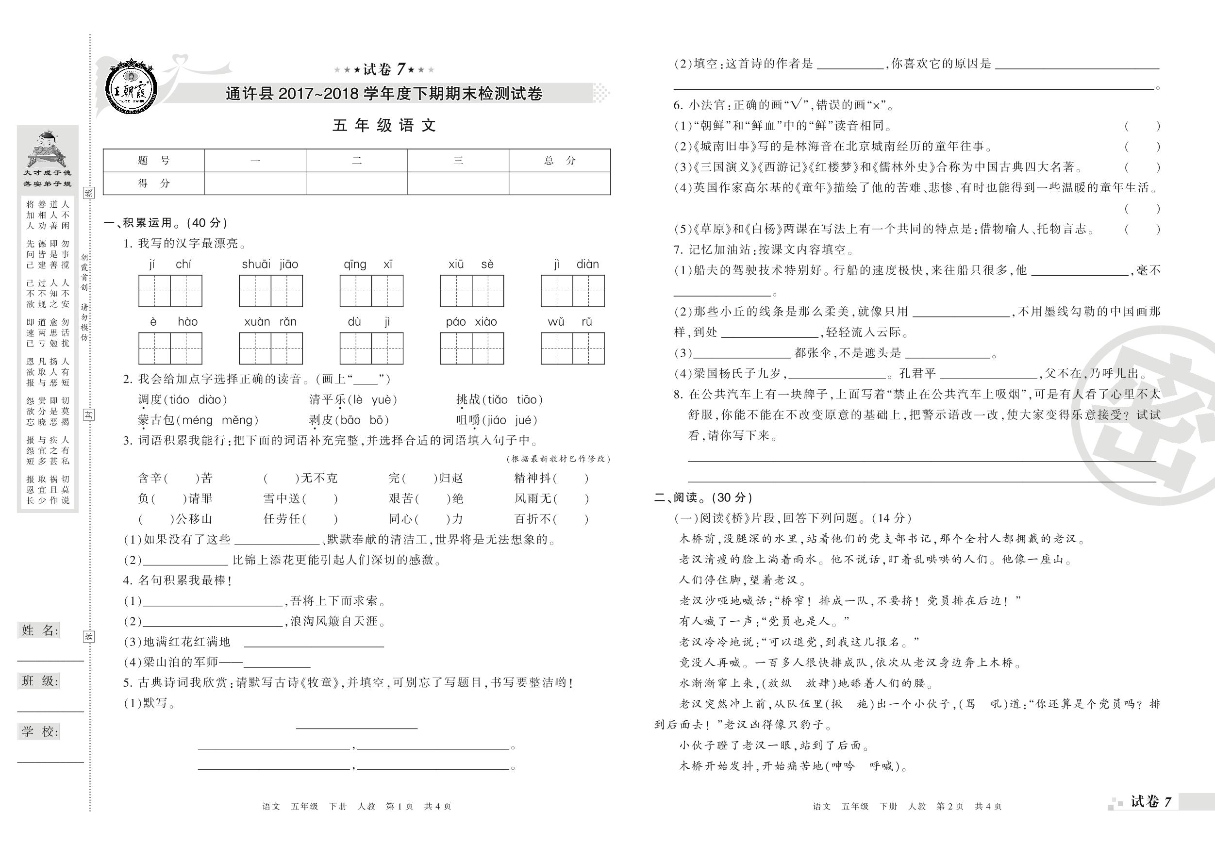 2017-2018学年第二学期开封市通许县五年级语文试卷(人教版)【7】