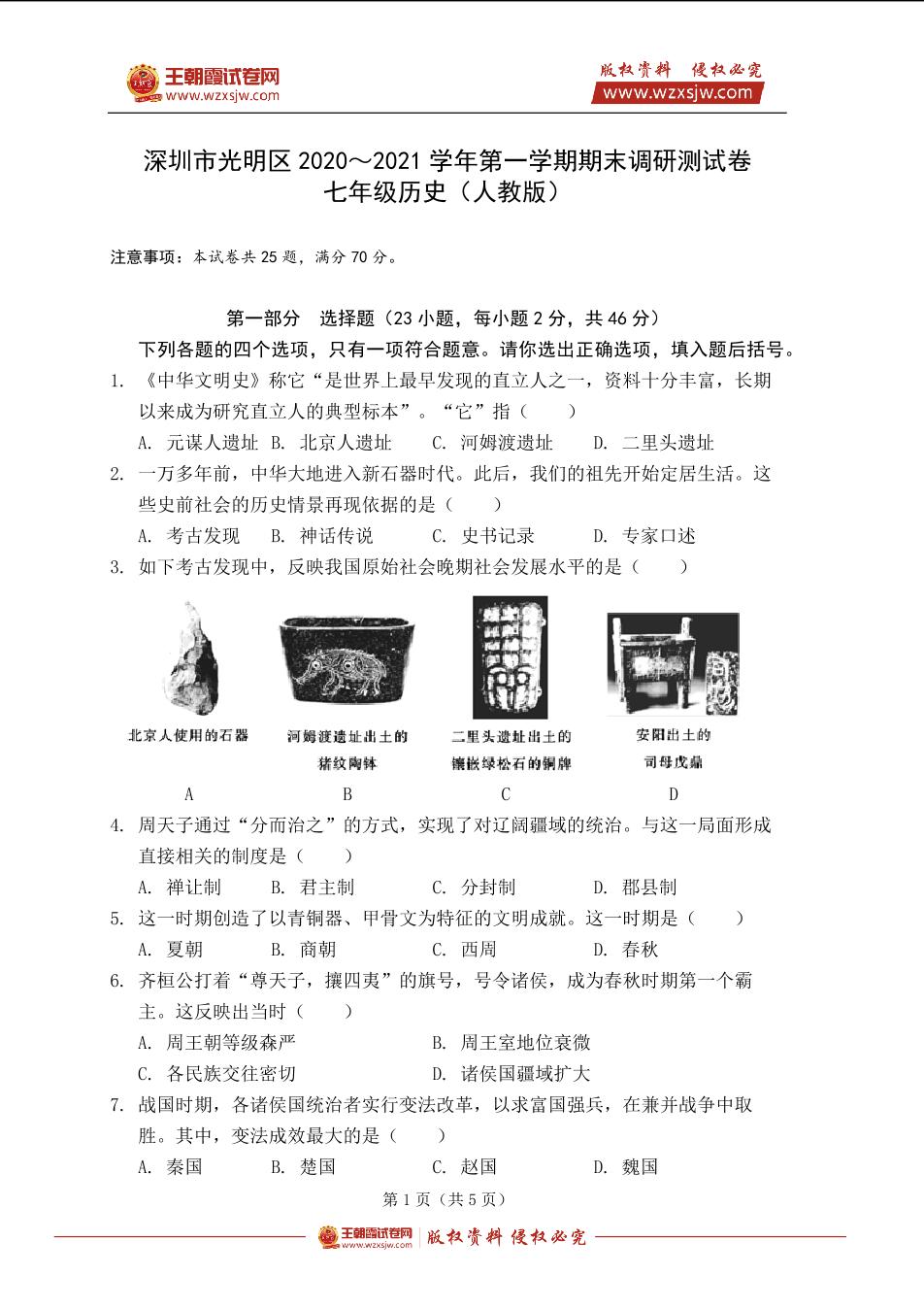 深圳市光明区2020~2021学年第一学期期末调研测试卷七年级历史(人教版)