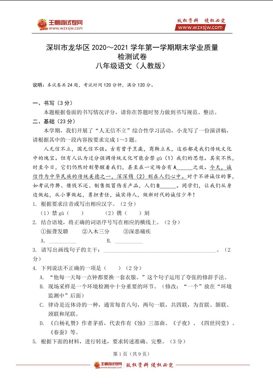 深圳市龙华区2020~2021学年八年级第一学期期末学业质量监测语文试卷(人教版)