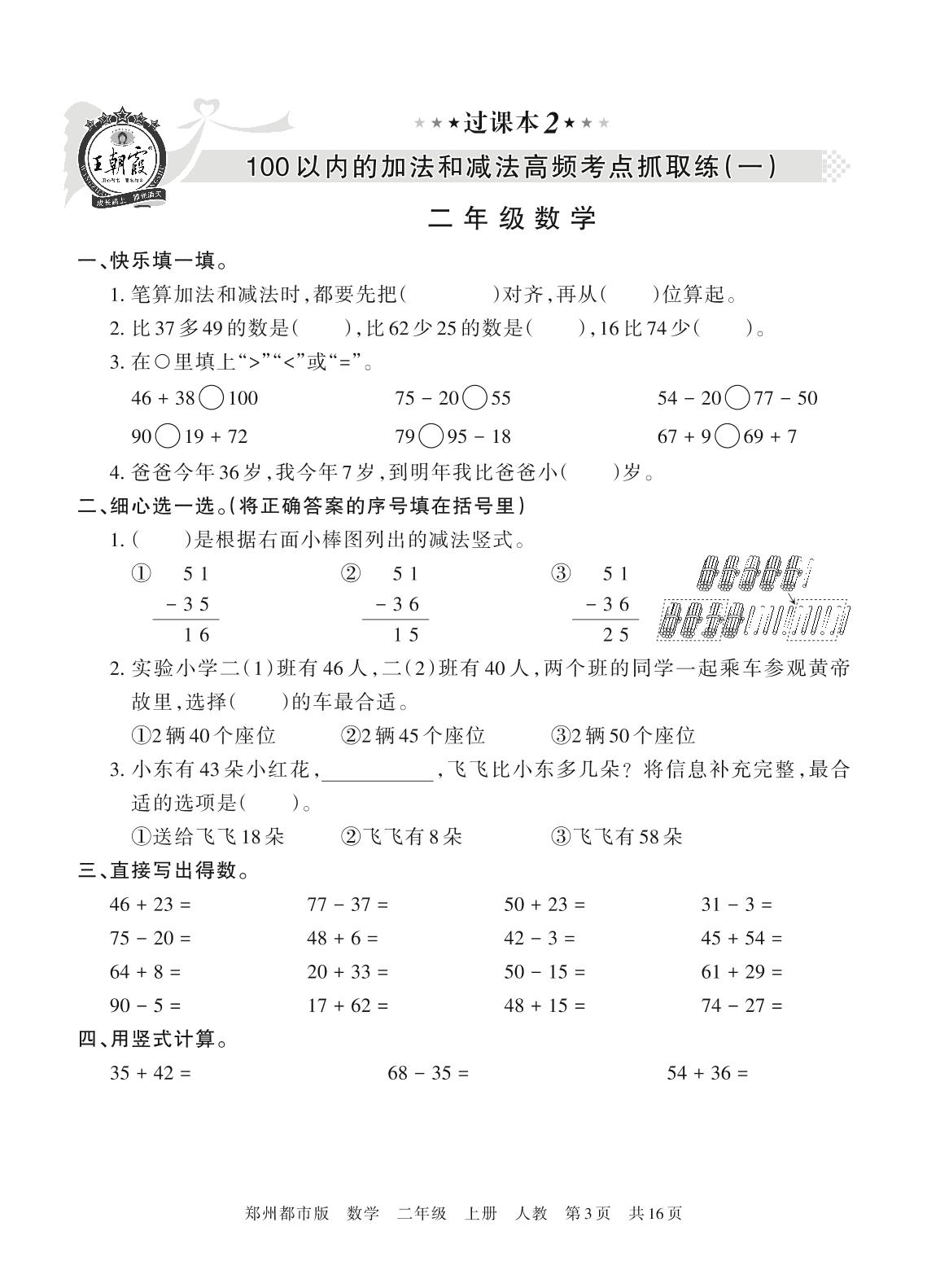 王朝霞期末过课本——100以内的加法和减法高频考点抓取练(一)二年级上册数学(人教版)_R211117161838154【2】