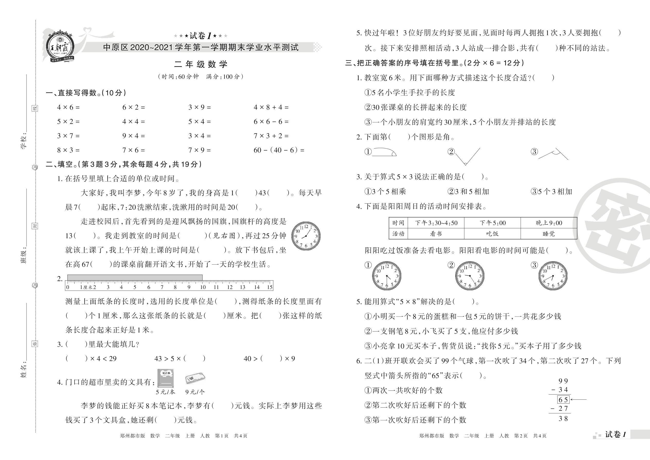中原区2020~2021学年第一学期期末学业水平测试二年级数学(人教版)【1】