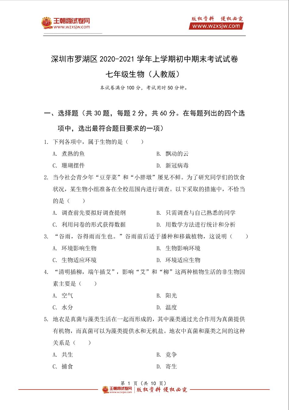 深圳市罗湖区2020-2021学年上学期初中七年级期末考试生物试卷(人教版)