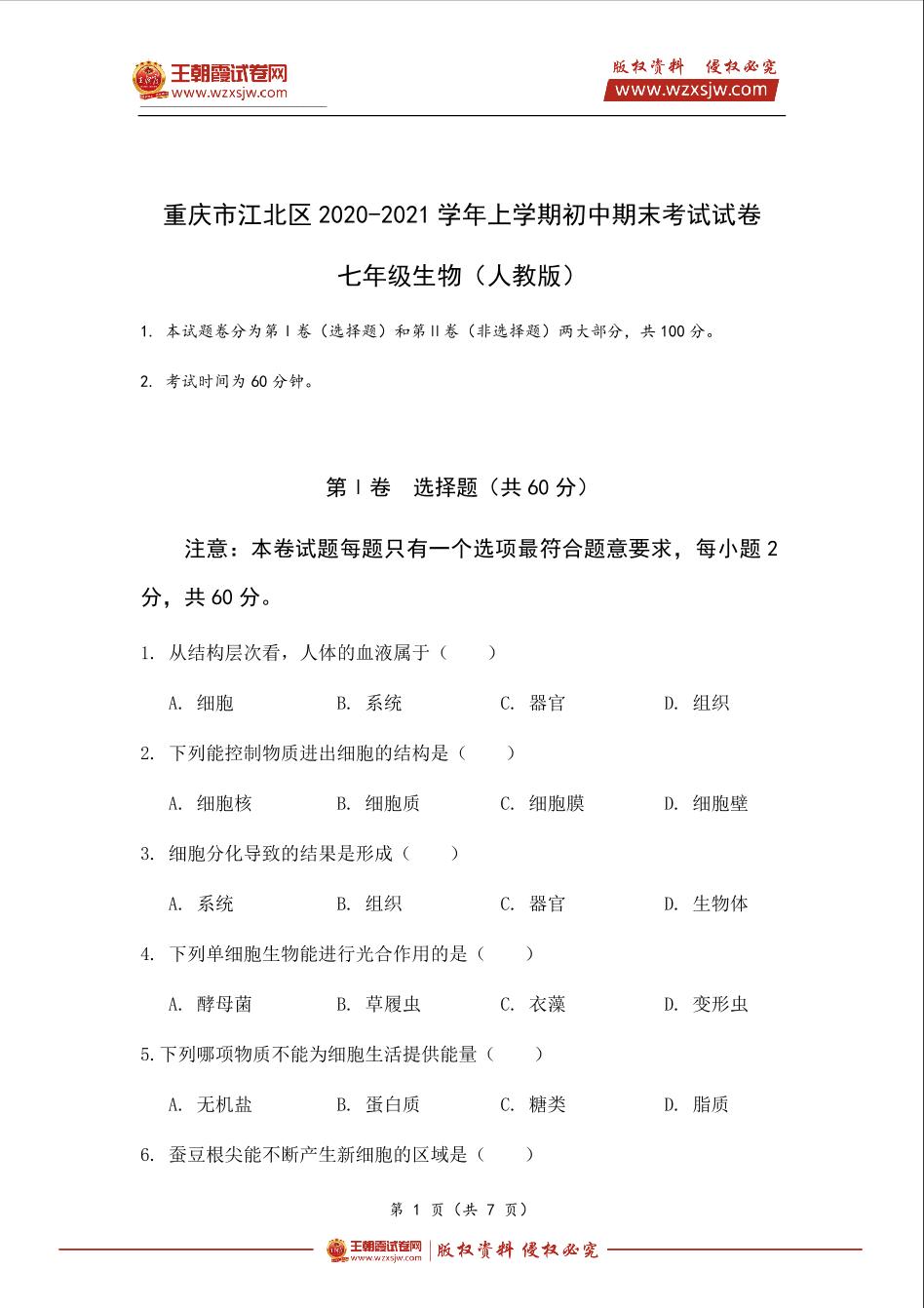 重庆市江北区2020-2021学年上学期初中七年级期末考试生物试卷(人教版)