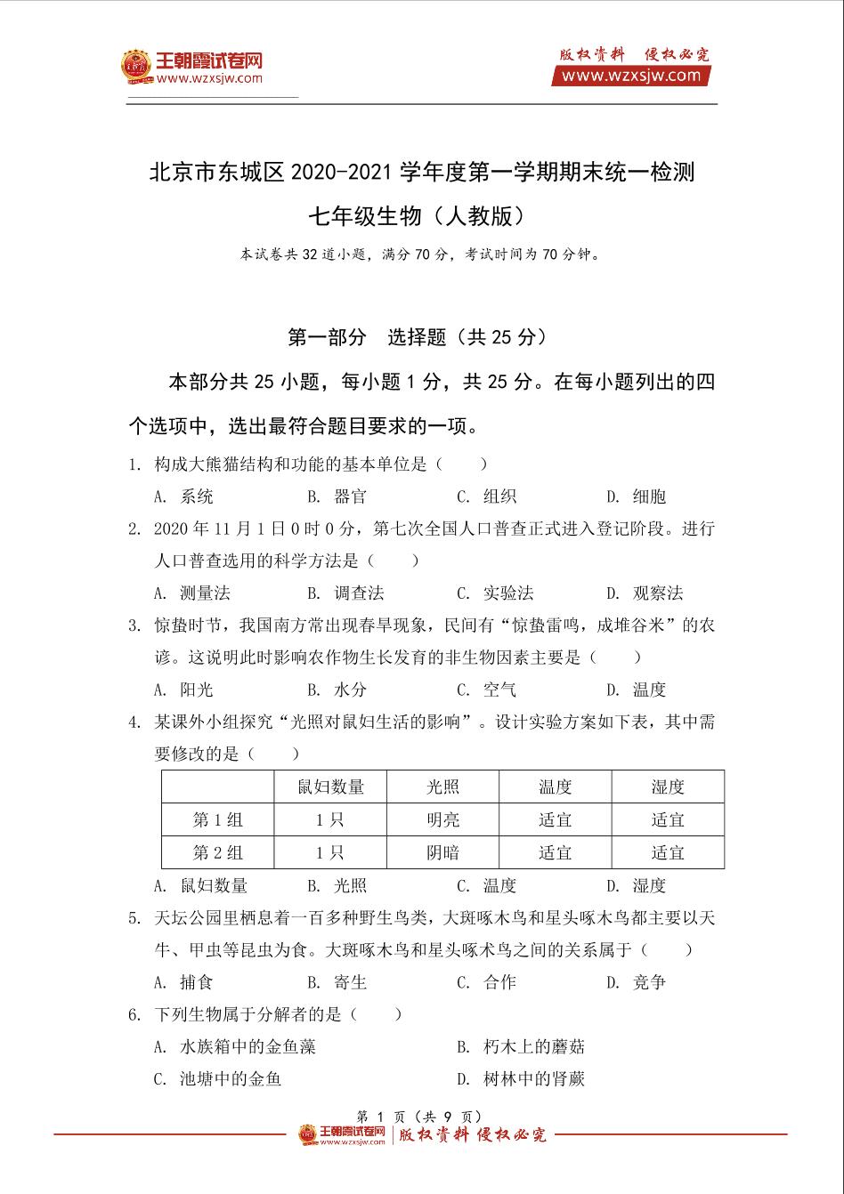 北京市东城区2020-2021学年上学期初中七年级期末考试生物试卷(人教版)