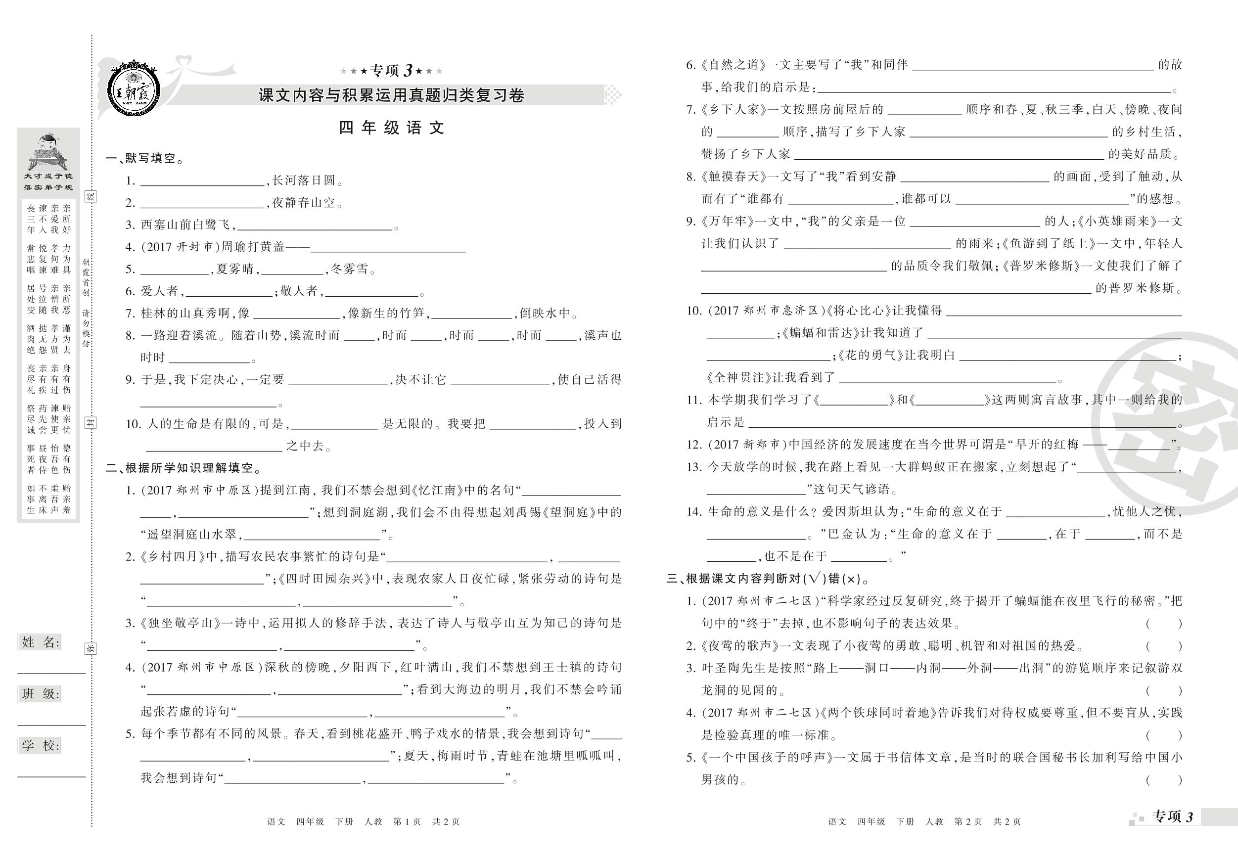 王朝霞期末专项卷——课文内容与积累运用、课内阅读与写作真题归类复习四年级下册语文(人教版)_R210801202530【0】
