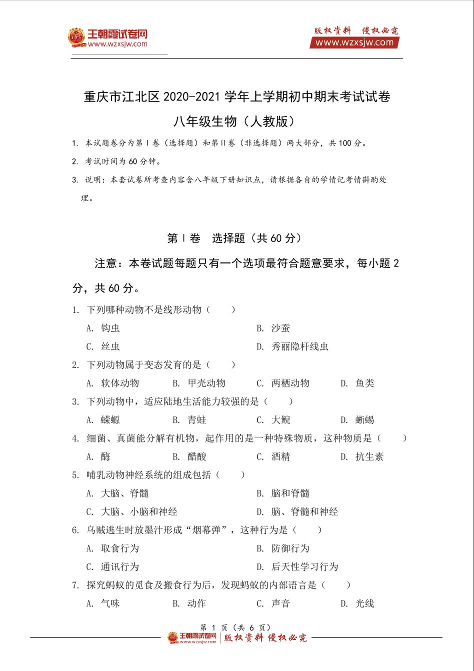 重庆市江北区2020-2021学年上学期初中八年级期末考试生物试卷(人教版)