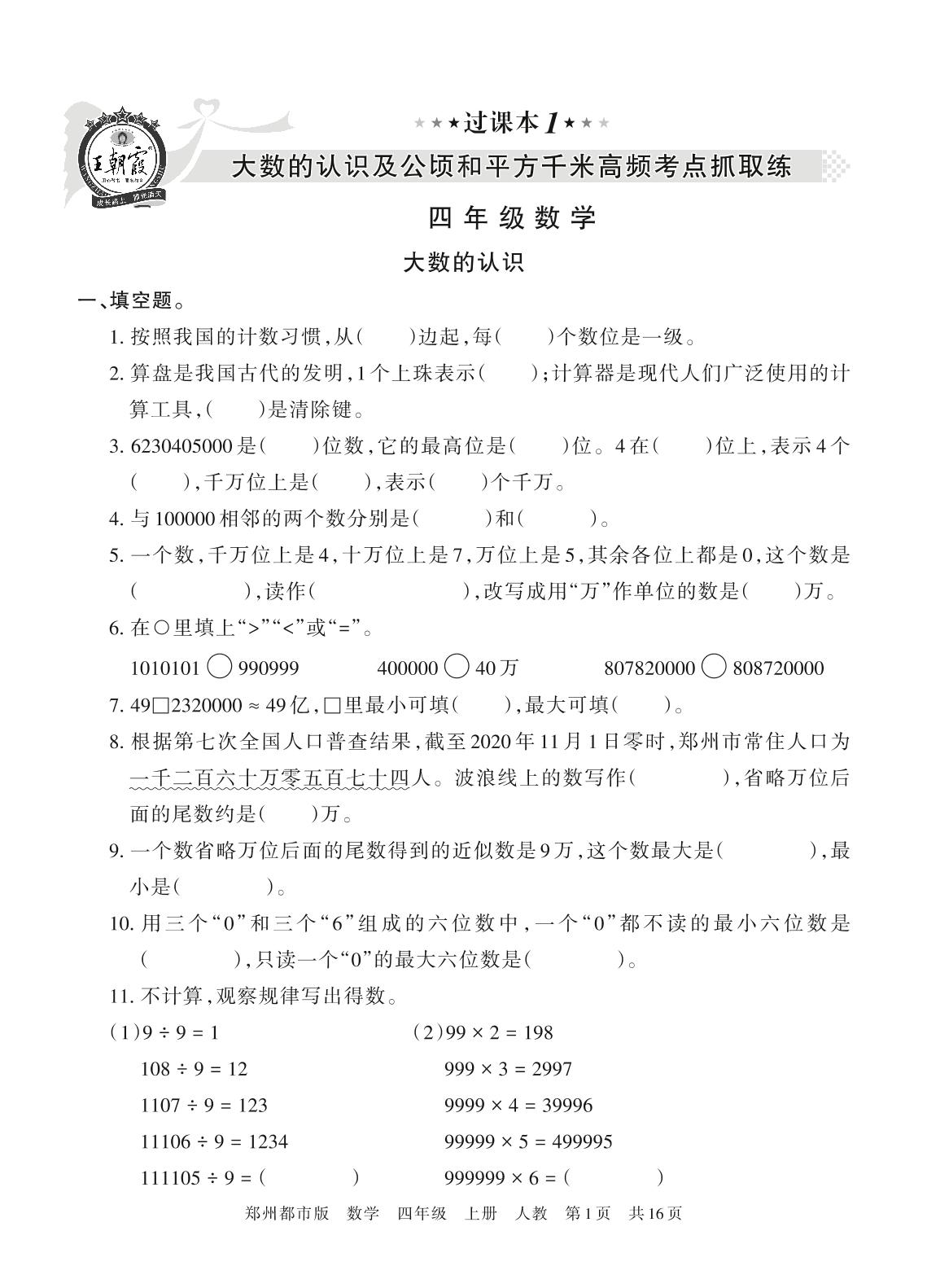 王朝霞期末过课本——大数的认识及公顷和平方千米高频考点抓取练四年级上册数学(人教版)_R211117162837761【1】