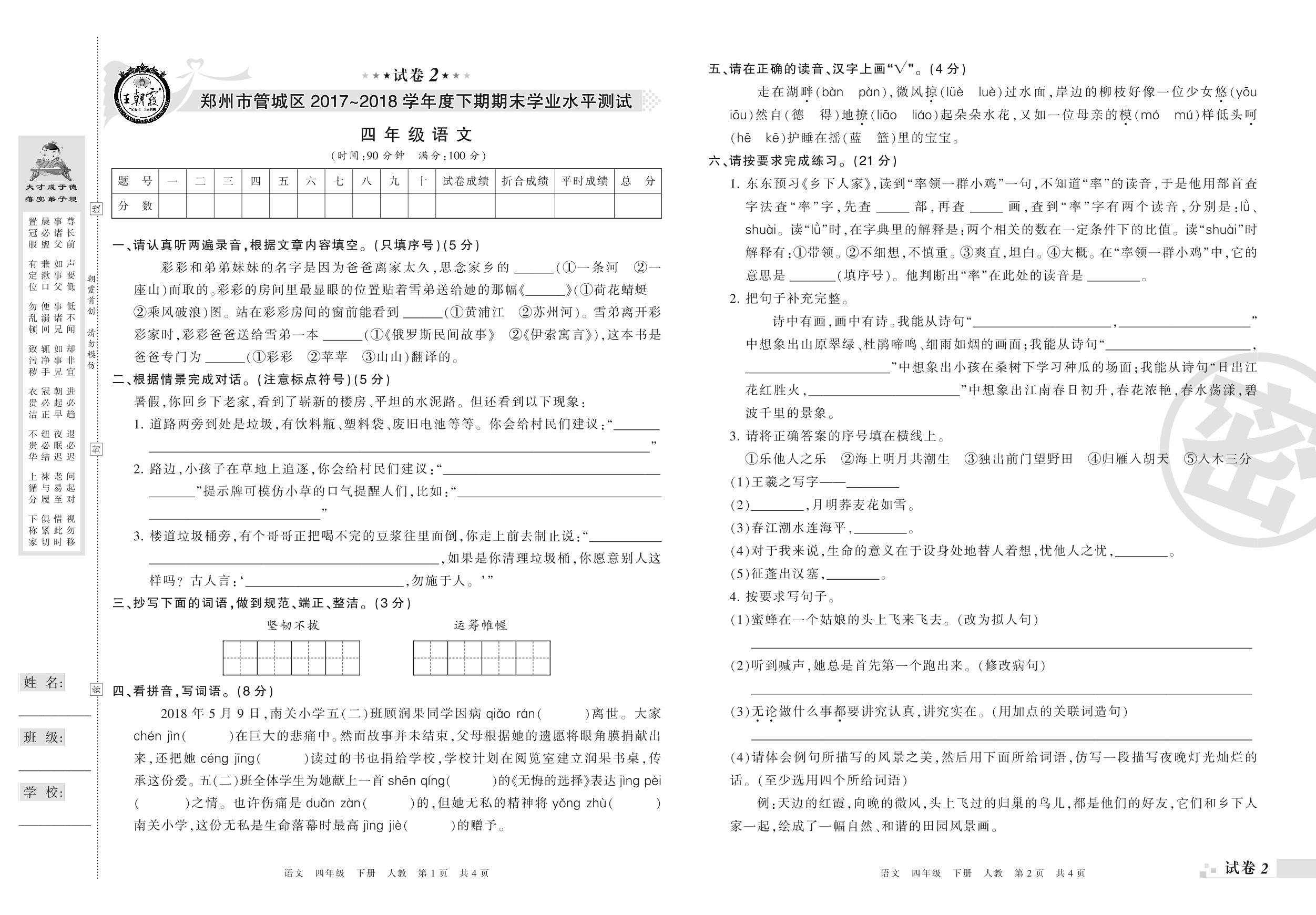2017-2018学年第二学期郑州市管城区四年级语文试卷(人教版)【2】