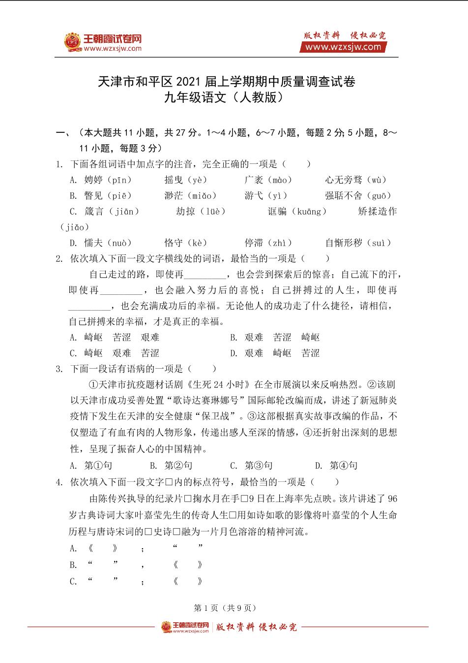 天津市和平区2021届上学期期中质量调查试卷九年级语文(人教版)