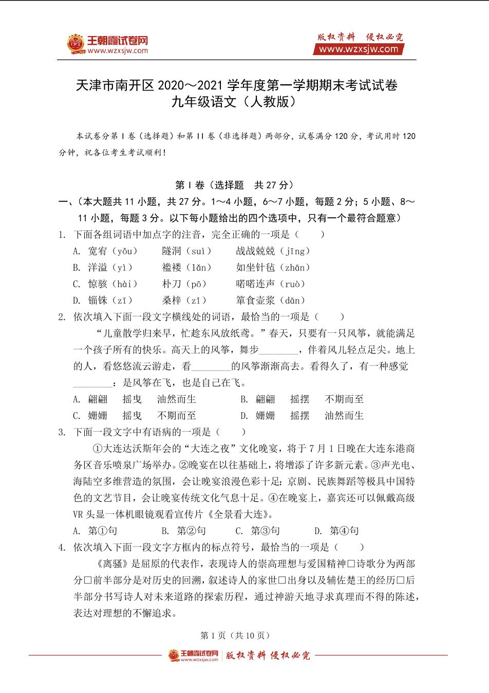 天津市南开区2020~2021学年度九年级第一学期期末考试语文试卷(人教版)