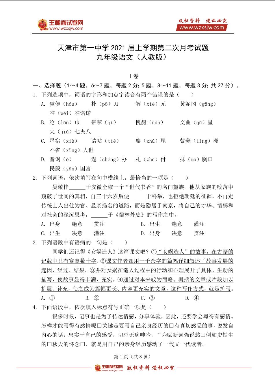 天津市第一中学2021届九年级上学期第二次月考语文试题(人教版)