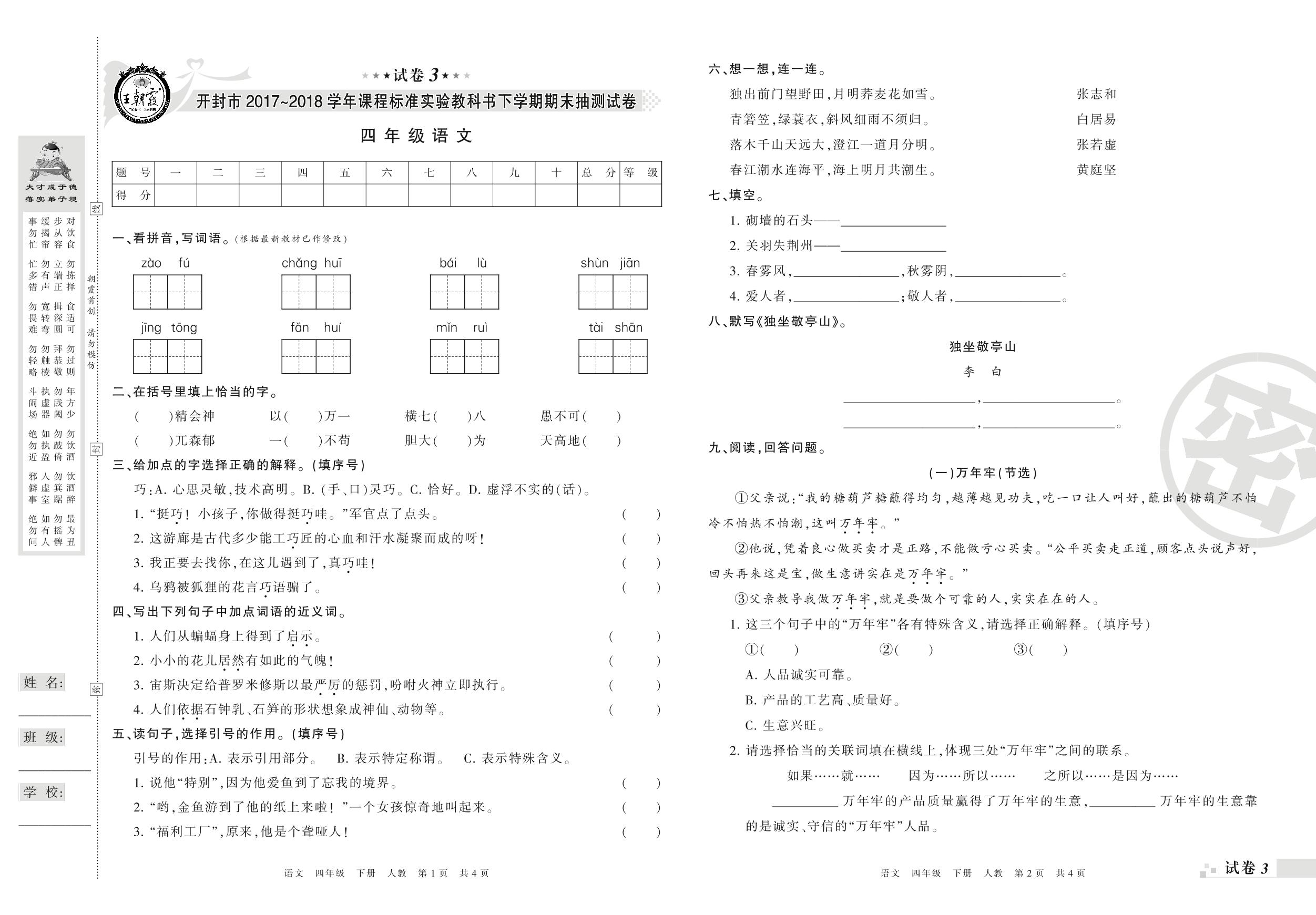 2017-2018学年第二学期开封市四年级语文试卷(人教版)【3】