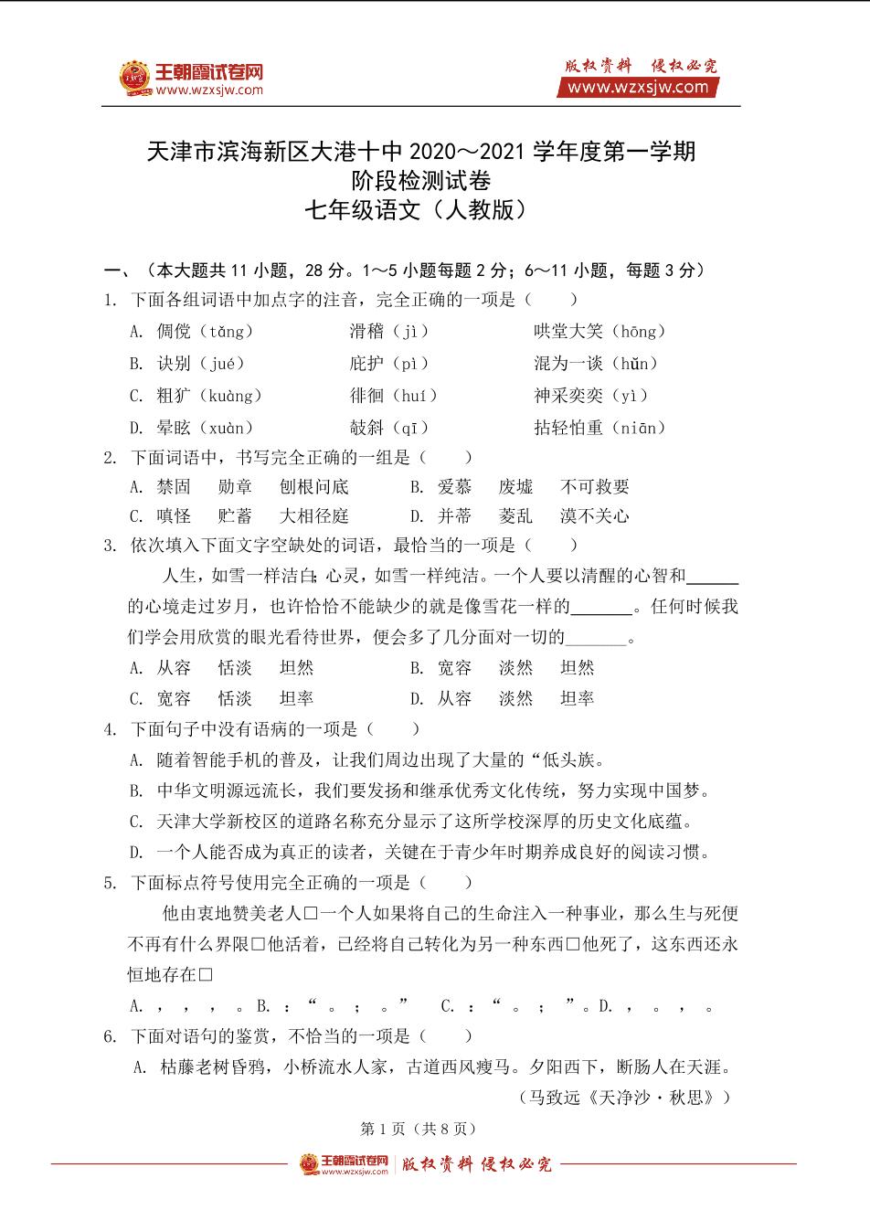 天津市滨海新区大港十中2020~2021学年度七年级第一学期阶段检测语文试卷(人教版)