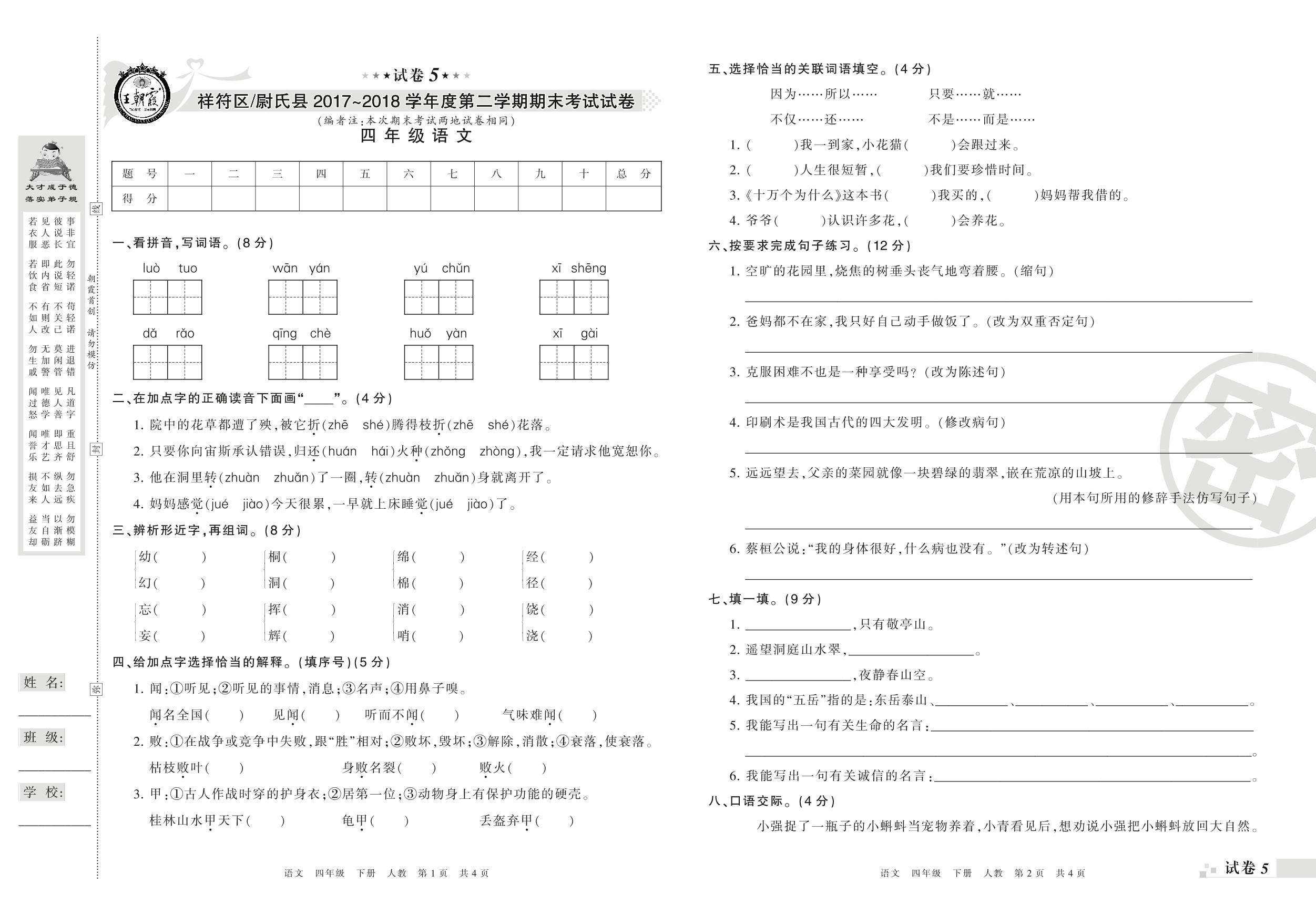 2017-2018学年第二学期开封市祥符区(尉氏县)四年级语文试卷(人教版)【5】
