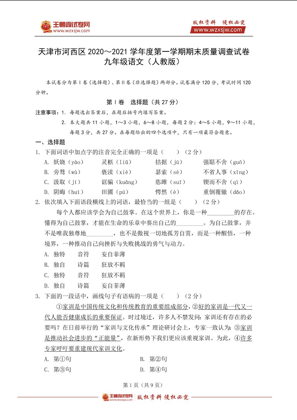 天津市河西区2020~2021学年度九年级第一学期期末质量调查语文试卷(人教版)