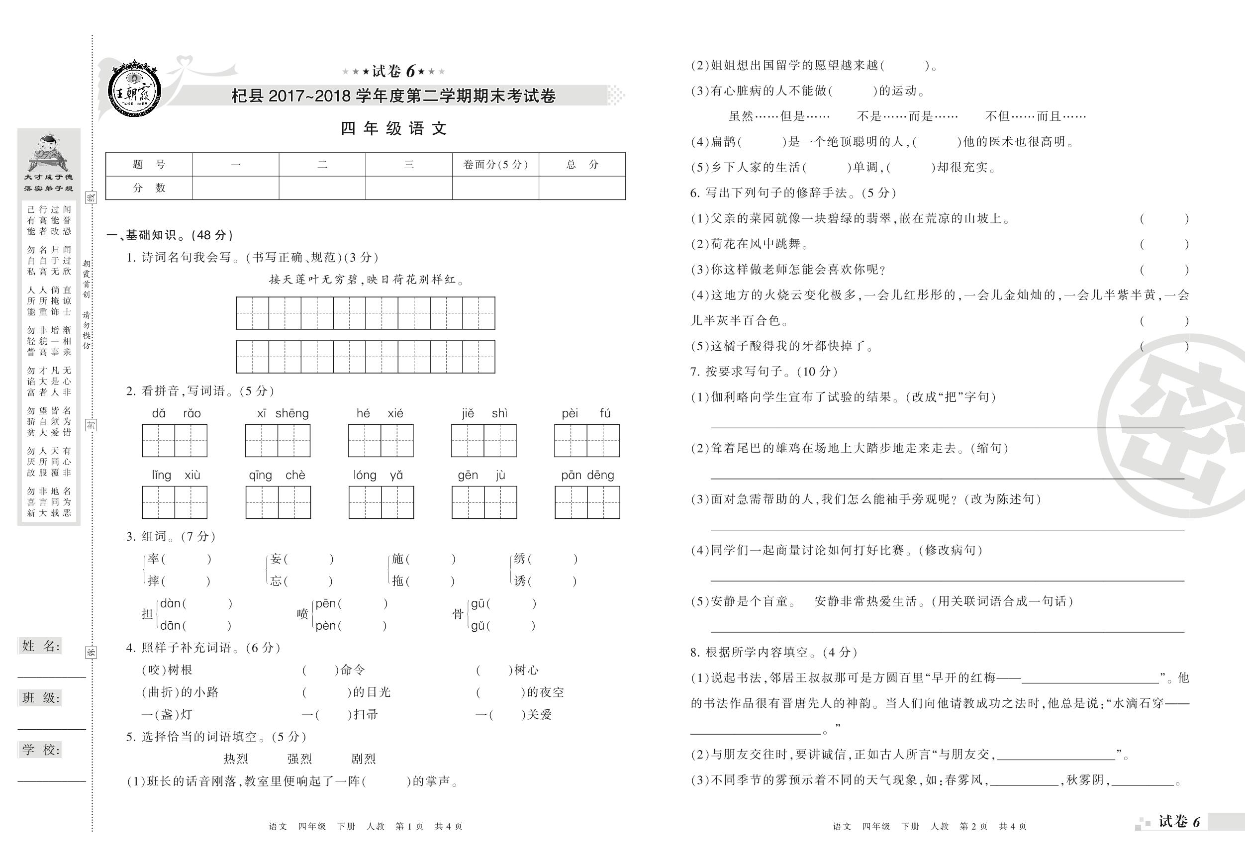 2017-2018学年第二学期开封市杞县四年级语文试卷(人教版)【6】