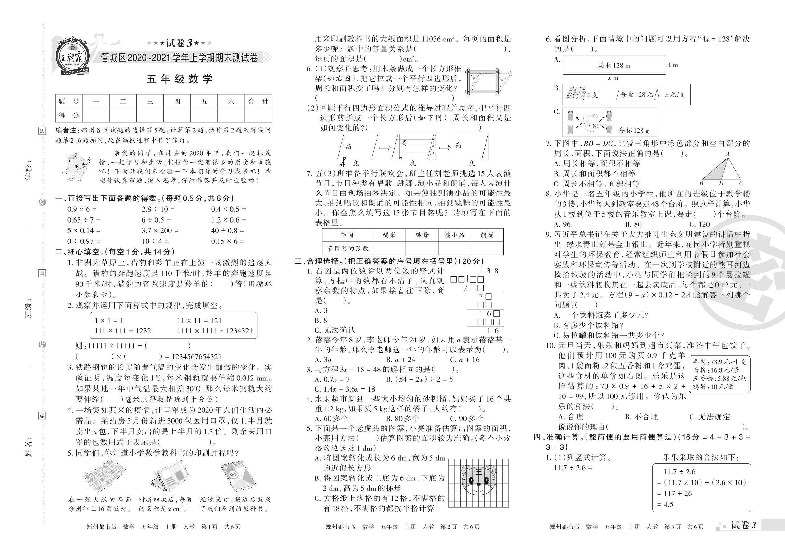 管城区2020~2021学年上学期期末测试卷五年级数学(人教版)【3】