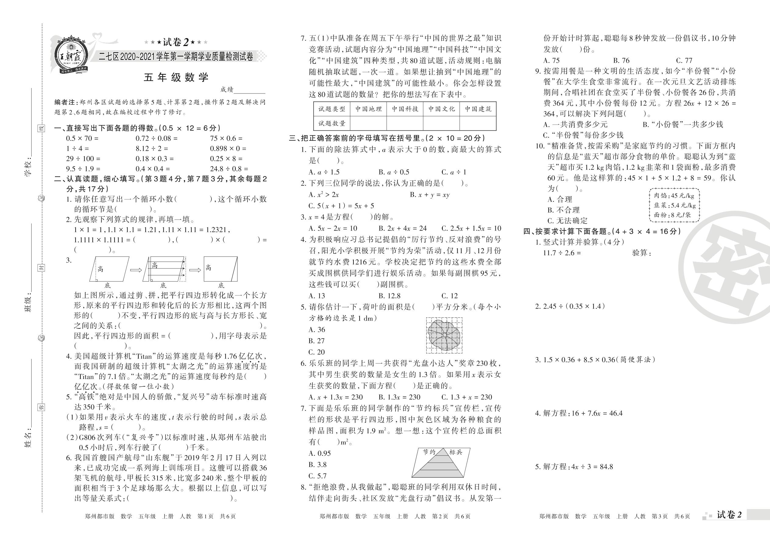 二七区2020~2021学年第一学期学业质量检测试卷五年级数学(人教版)【2】