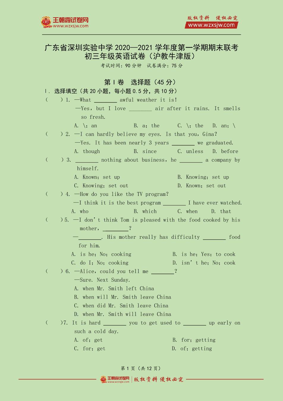 广东省深圳实验中学2020—2021学年度第一学期期末联考初三年级英语试卷(沪教牛津版)