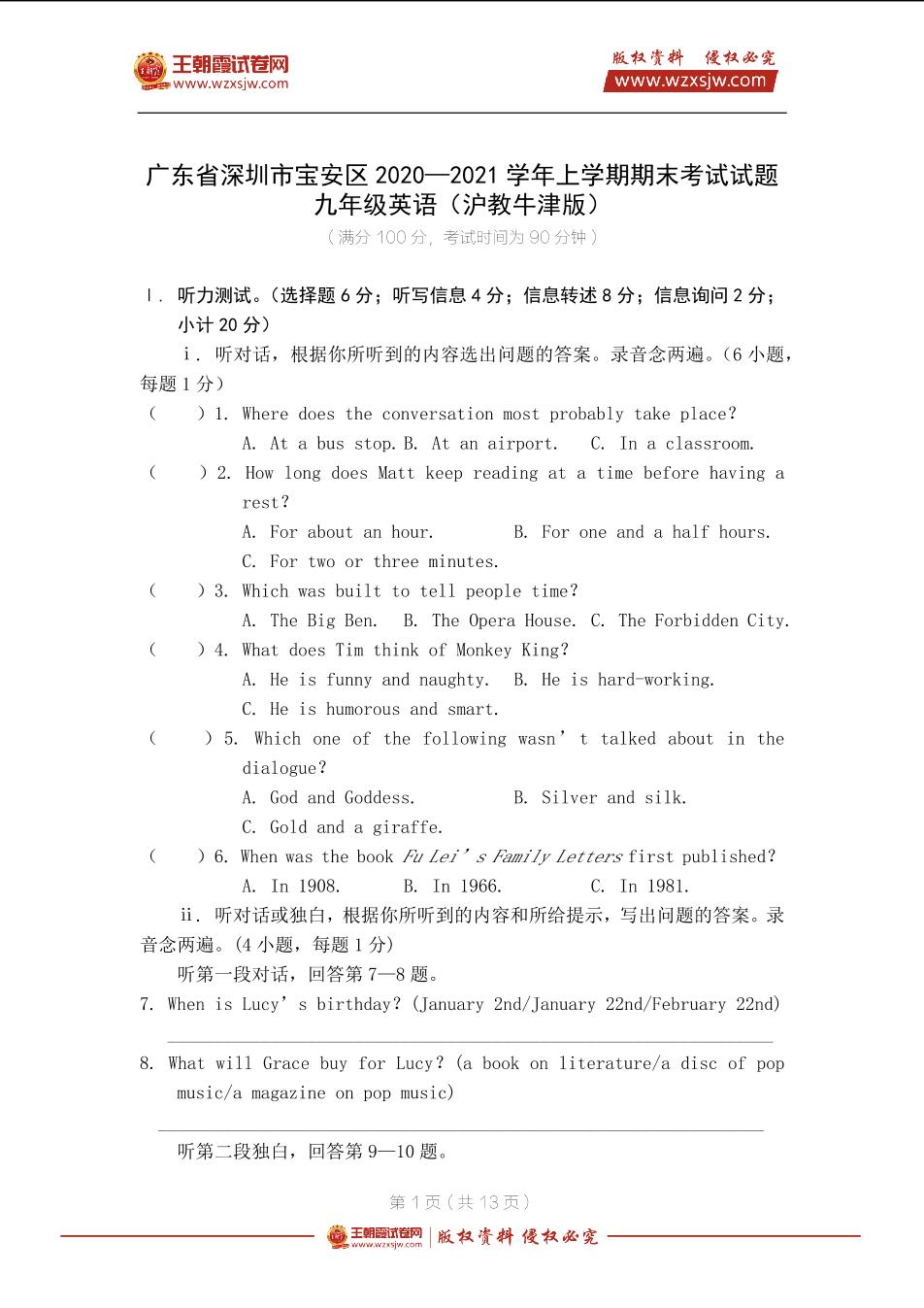 广东省深圳市宝安区2020—2021学年上学期期末考试试题九年级英语(沪教牛津版)