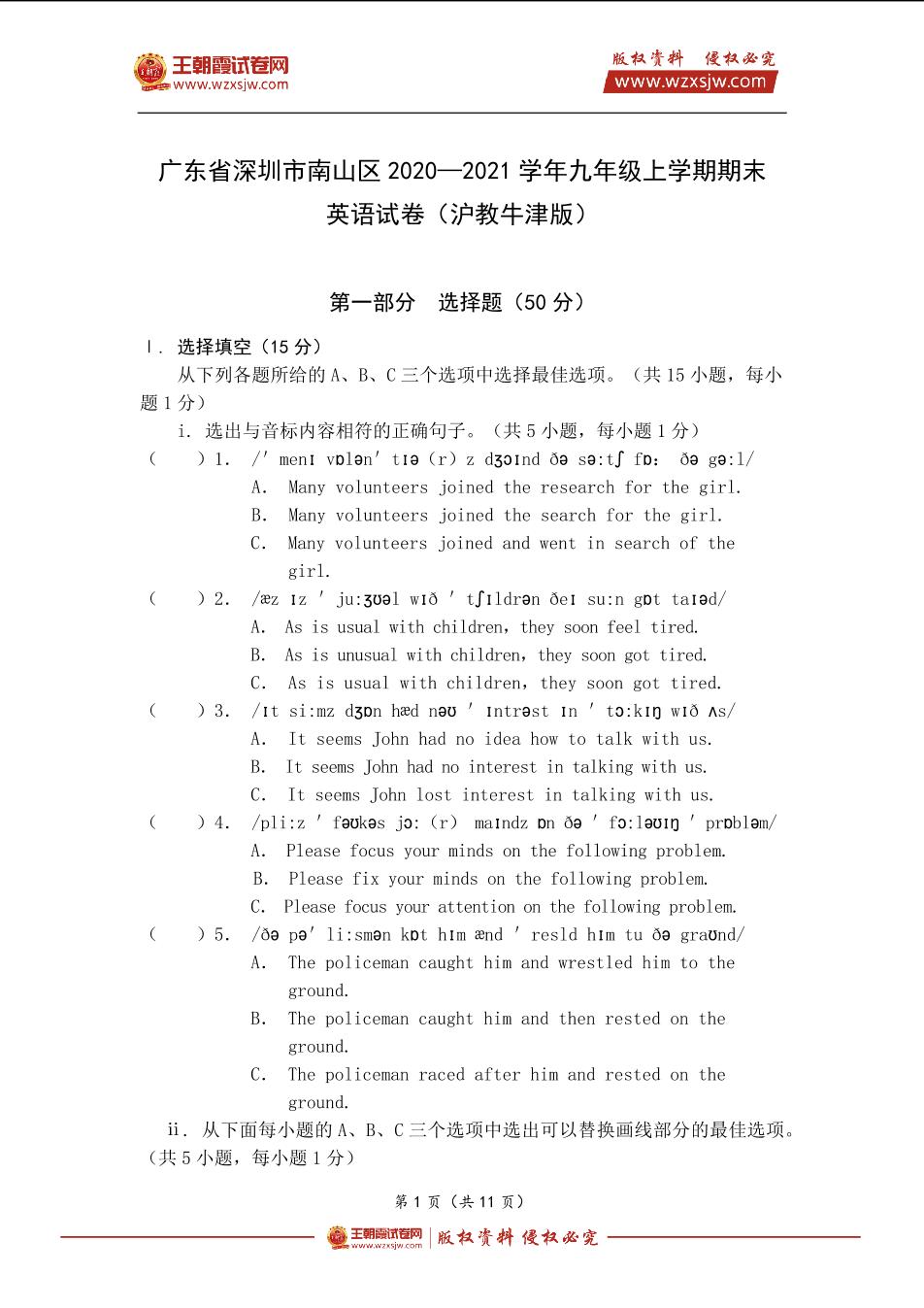 广东省深圳市南山区2020—2021学年九年级上学期期末英语试卷(沪教牛津版)