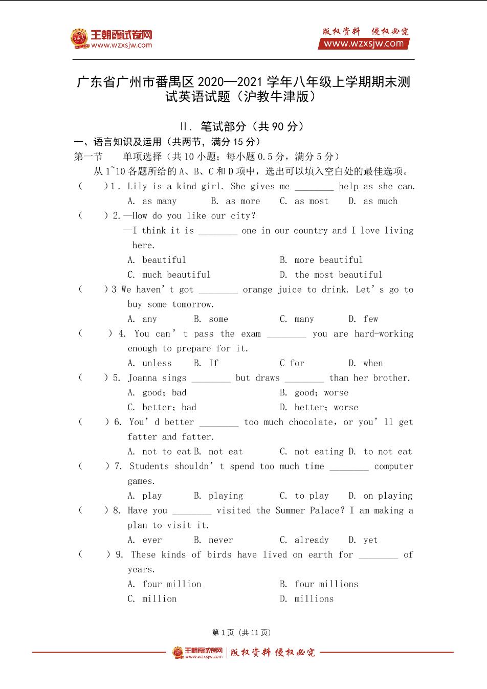 广东省广州市番禺区2020—2021学年八年级上学期期末测试英语试题(沪教牛津版)