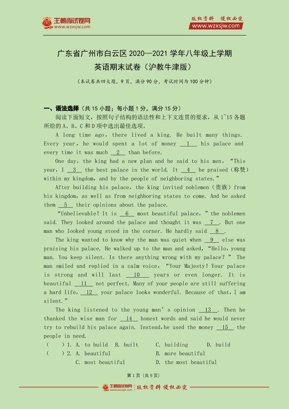 广东省广州市白云区2020—2021学年八年级上学期英语期末试卷(沪教牛津版)