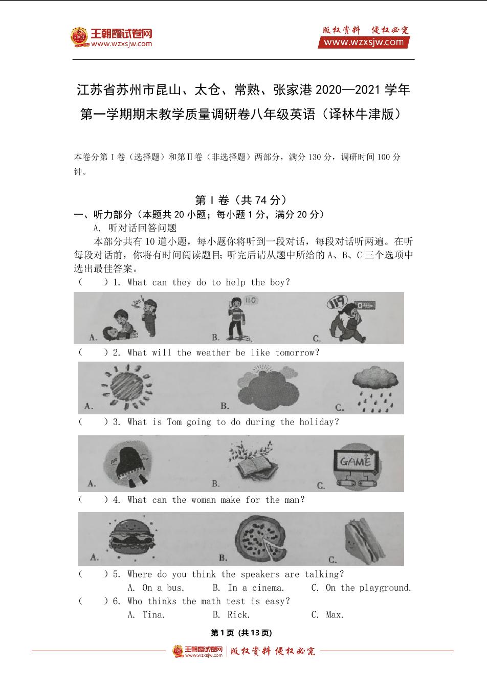 江苏省苏州市昆山、太仓、常熟、张家港2020—2021学年第一学期期末教学质量调研卷八年级英语(译林牛津版)