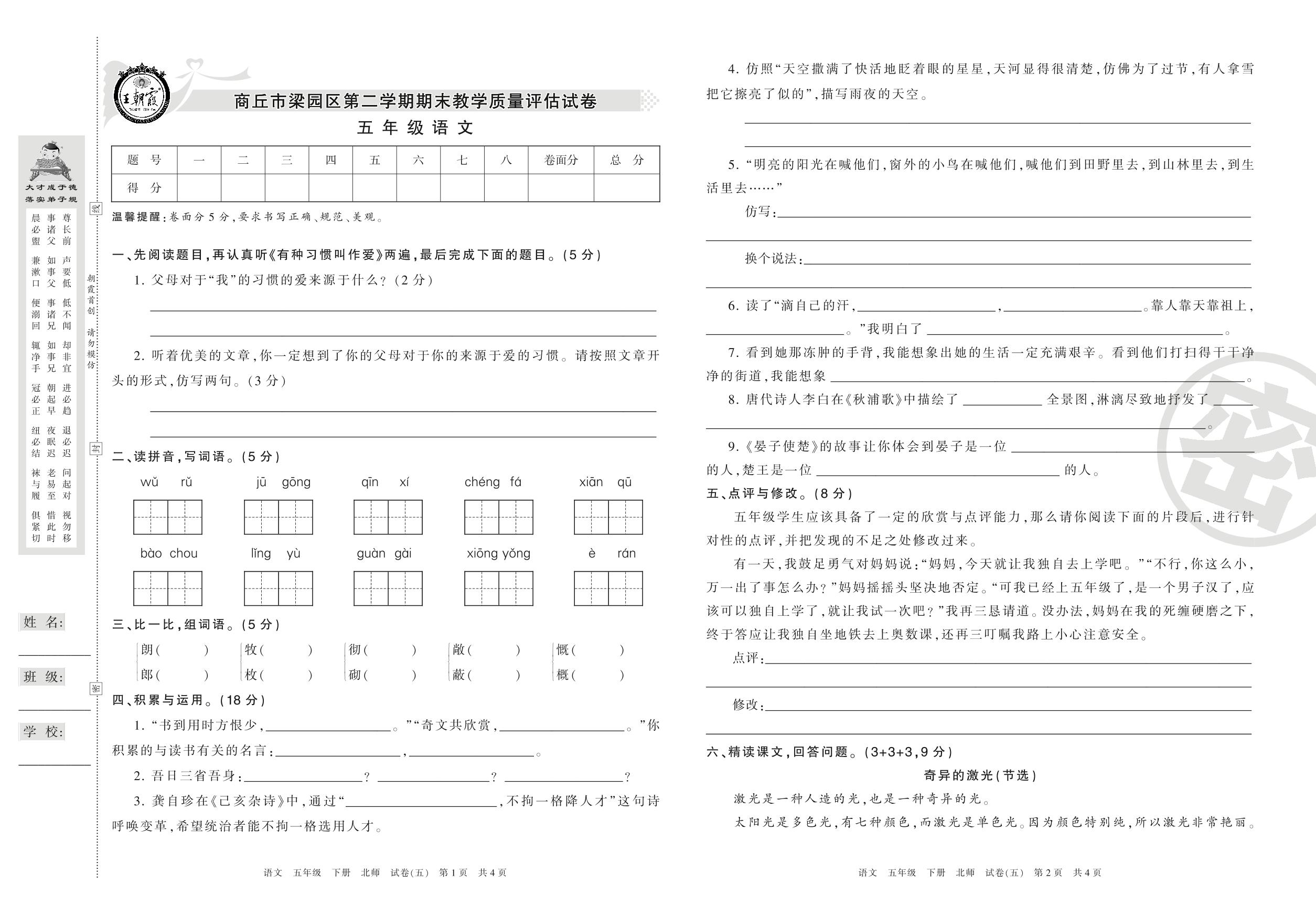 2015-2016学年第二学期商丘市梁园区五年级语文试卷(北师版)【5】