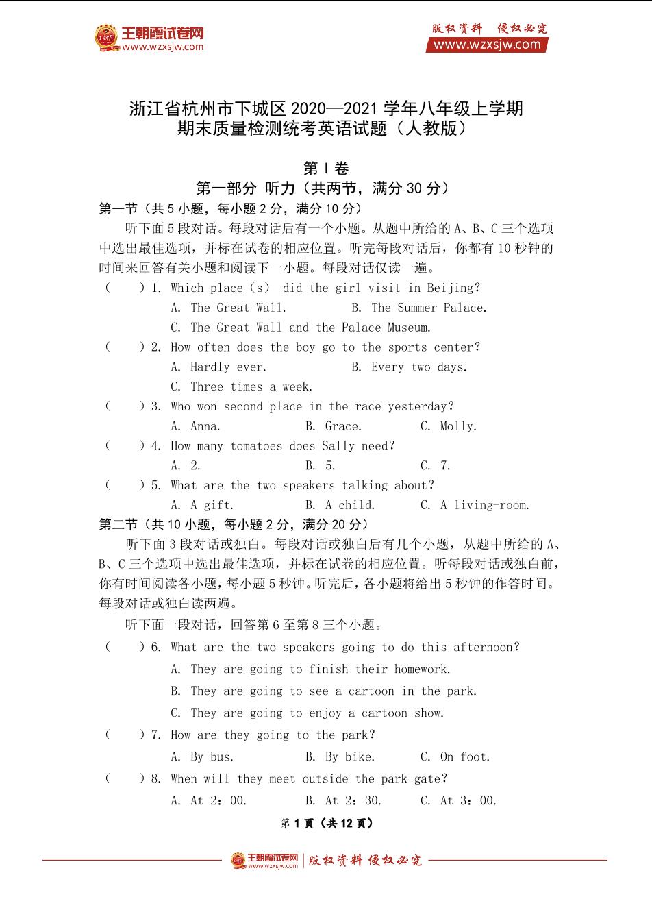 浙江省杭州市下城区2020—2021学年八年级上学期期末质量检测统考英语试题(人教版)