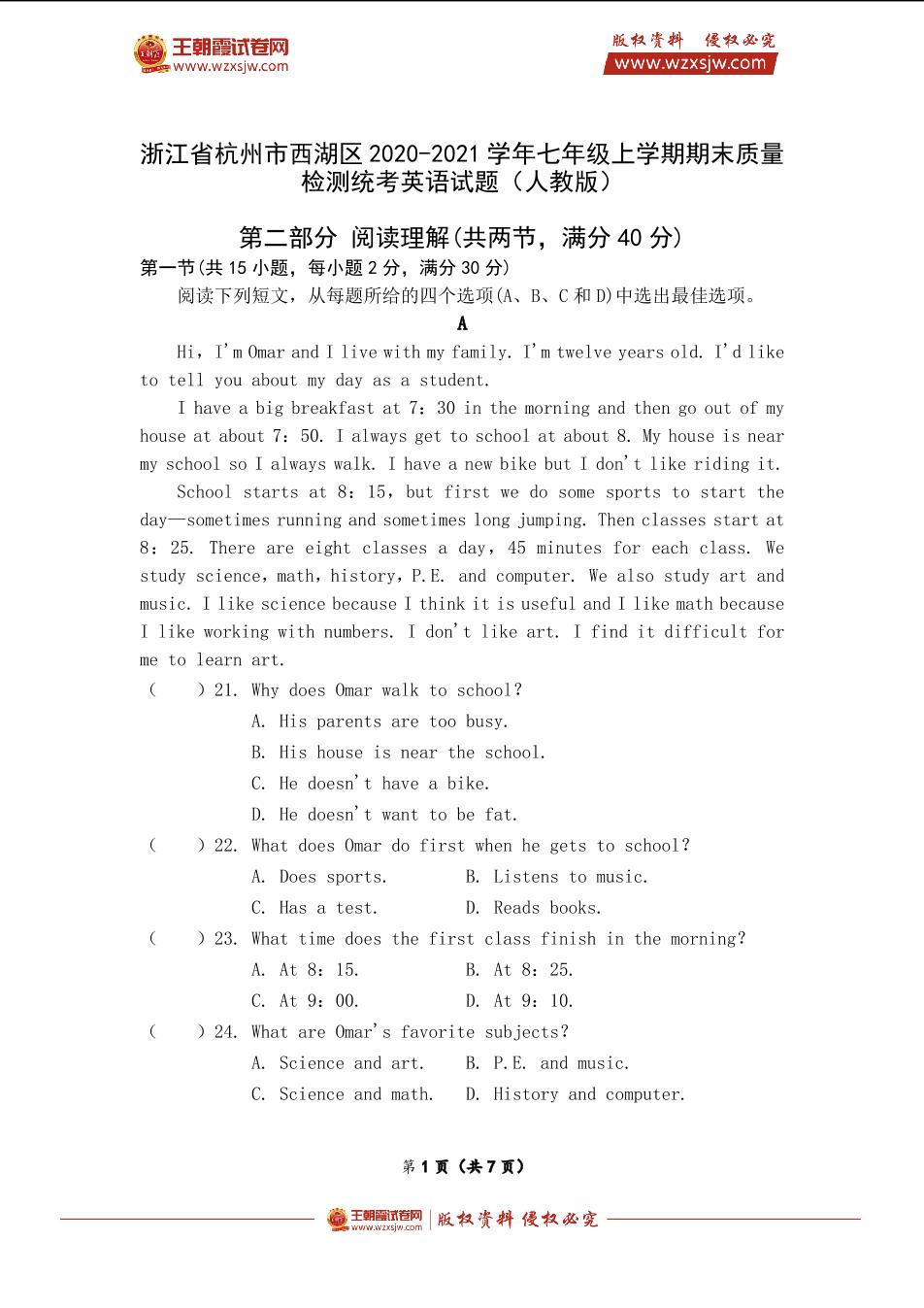 浙江省杭州市西湖区2020-2021学年七年级上学期期末质量检测统考英语试题(人教版)