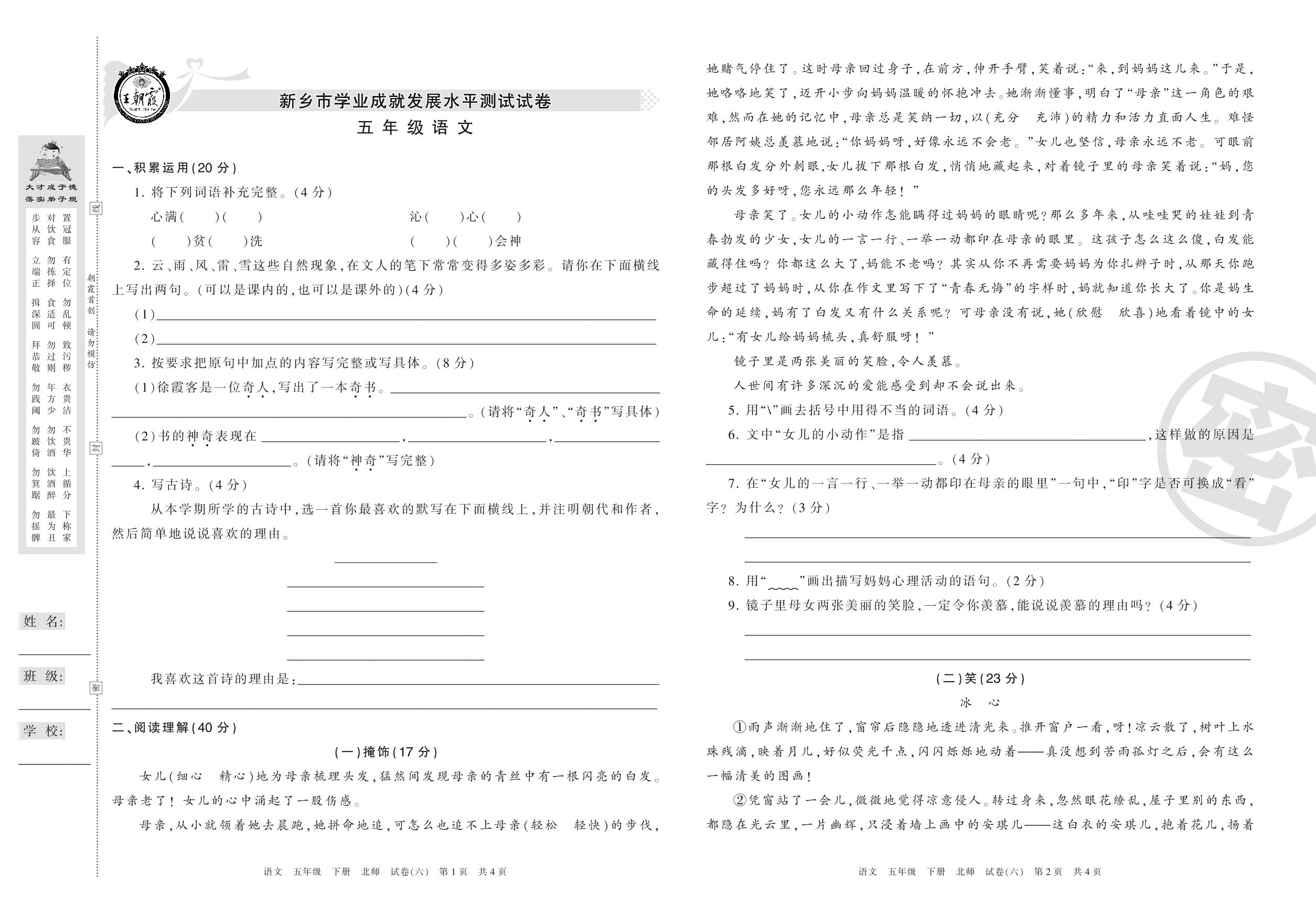 2015-2016学年第二学期新乡市五年级语文试卷(北师版)【6】